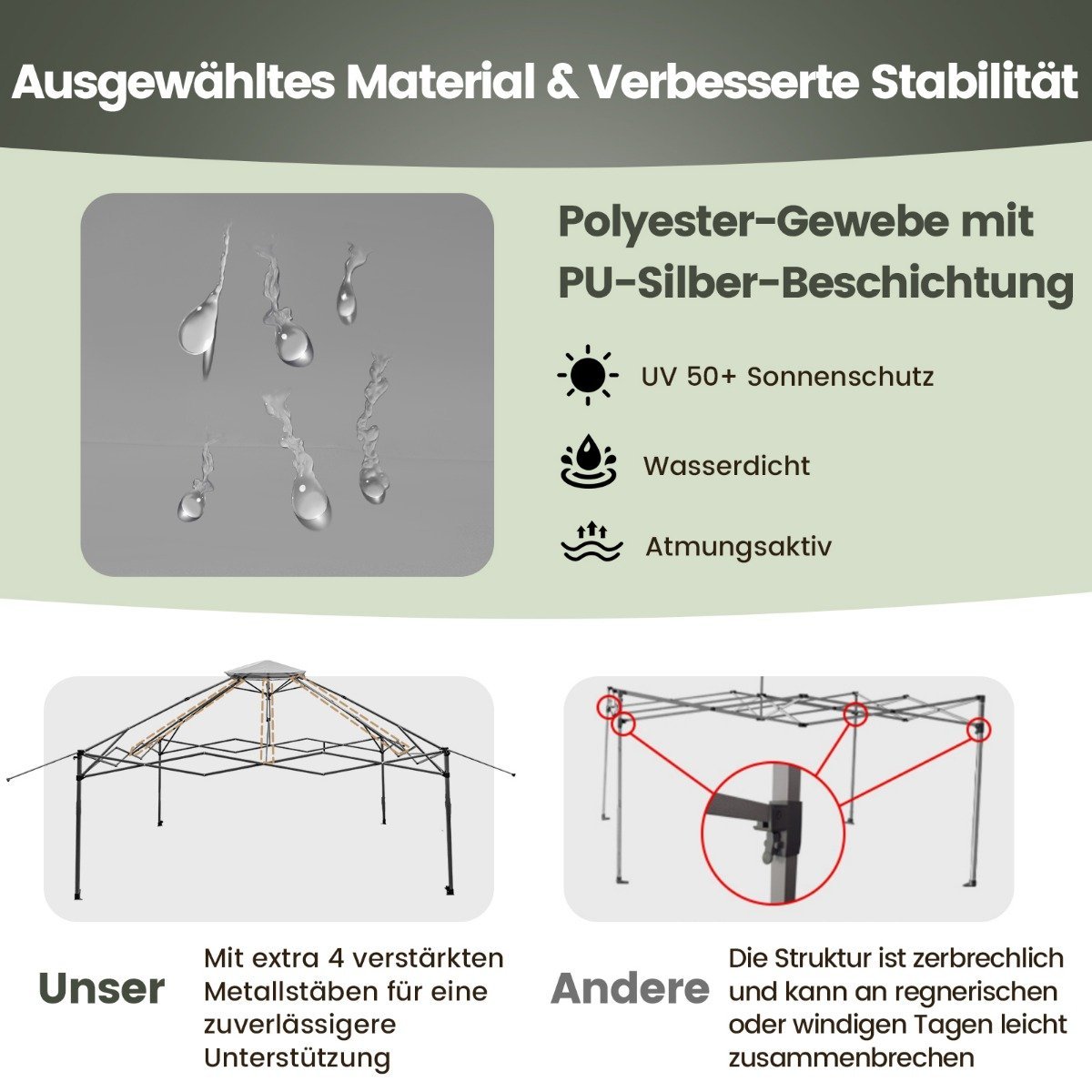 Užtikrinkite optimalų komfortą savo lauko renginiuose su šiuo nešiojamu sodo paviljonu! Tai puikus pasirinkimas ieškantiems sprendimo, suteikiančio pavėsį ir puikų vėdinimą.