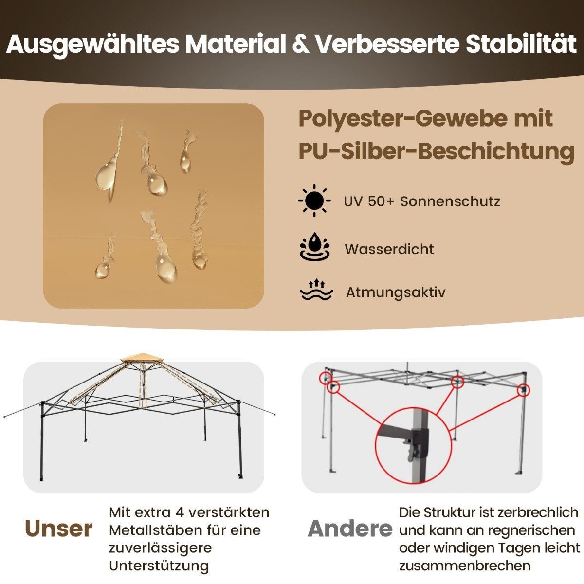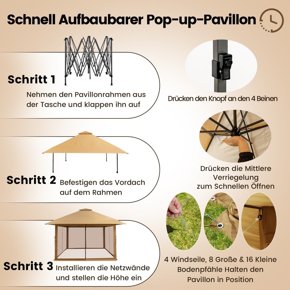 Mėgaukitės optimaliu komfortu su šiuo nešiojamu sodo paviljonu! Jis puikiai tiks įvairioms lauko veikloms, tokioms kaip piknikai, vakarėliai ar jaukūs susibūrimai.