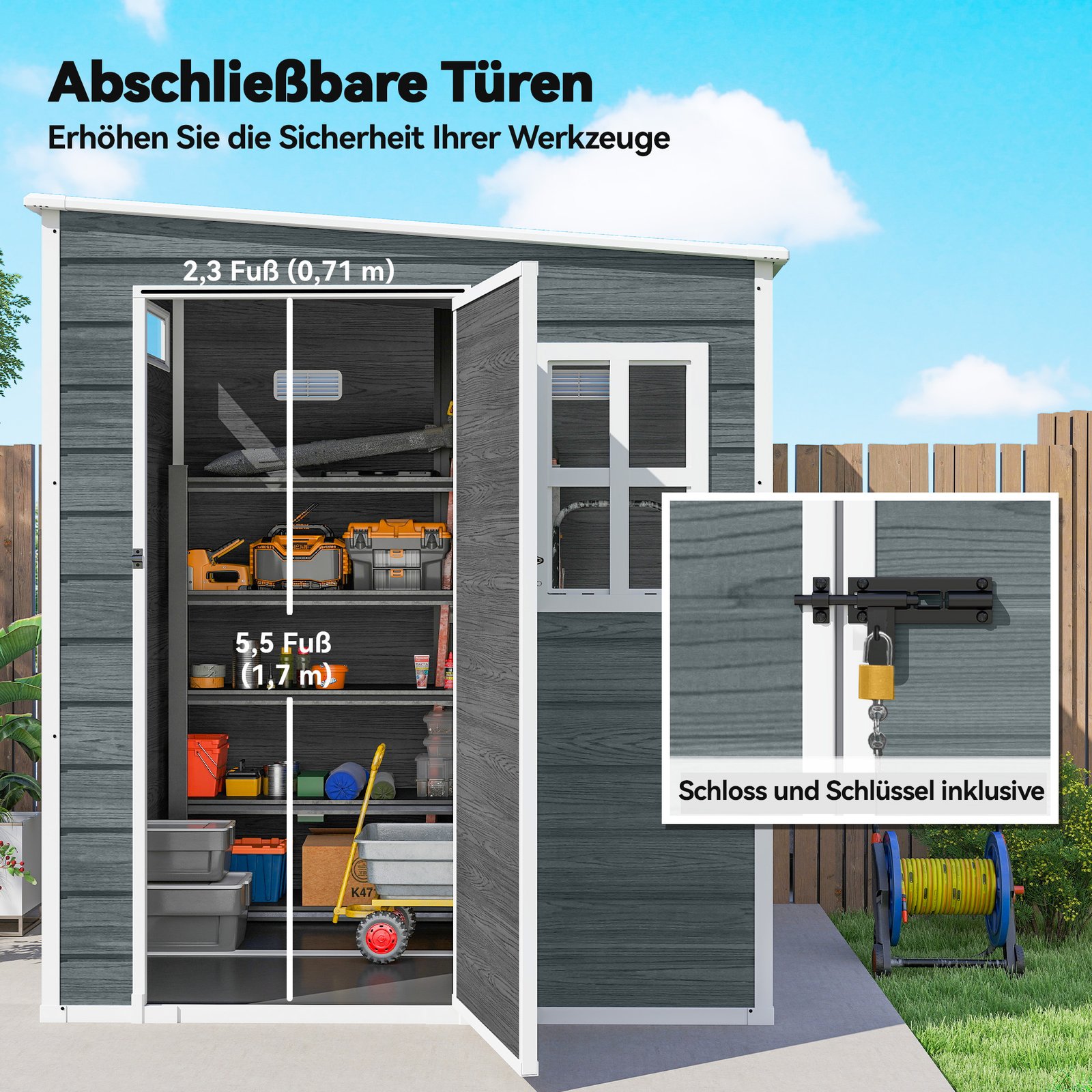 Netvarka sodo namelyje gali priversti jūsų sodą atrodyti chaotiškai, o tamsa ir drėgmė gali sugadinti jūsų įrankius. Viską rasite be vargo ir žinosite, kad jūsų įranga yra apsaugota. Sodo namelis turi vietą taupančias duris su užraktu, tris šviesius langus ir dvi ventiliacijos angas. UV spinduliams atspari, tvirta konstrukcija užtikrina jūsų daiktų saugumą ir tvarką.