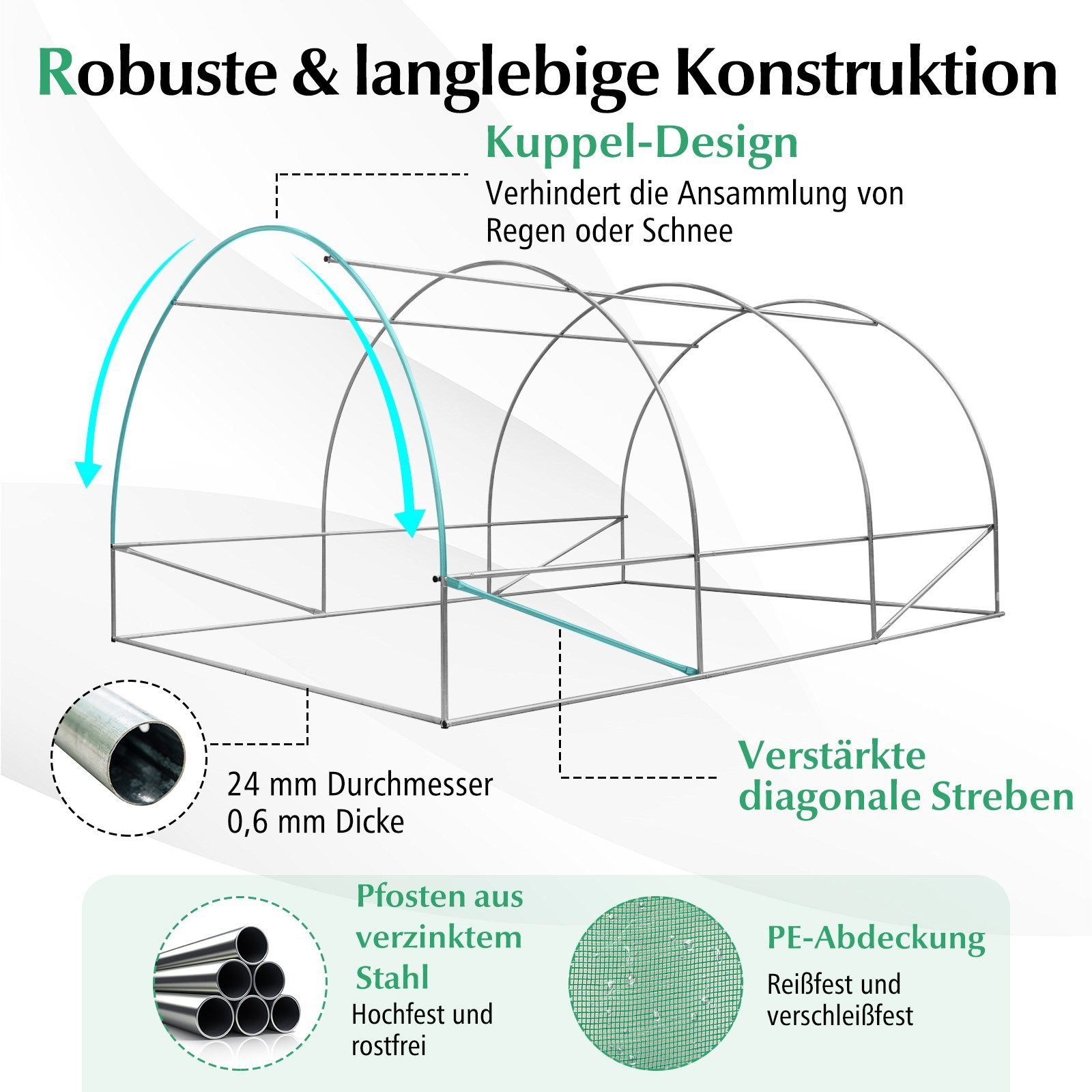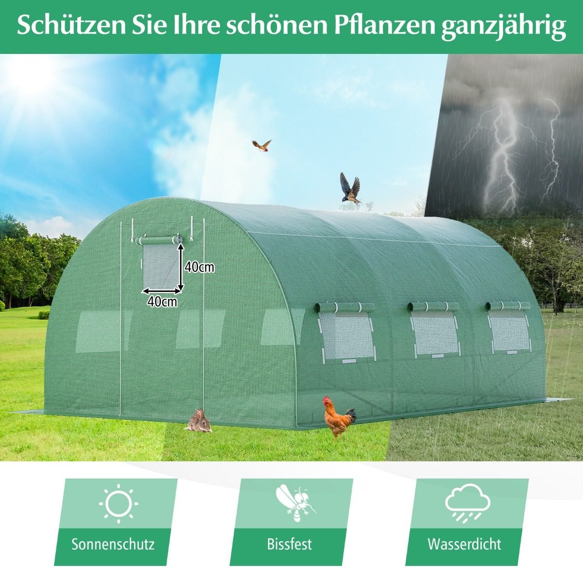 - Aukštos kokybės PE danga apsaugo augalus nuo UV spindulių, šalčio ir karščio.