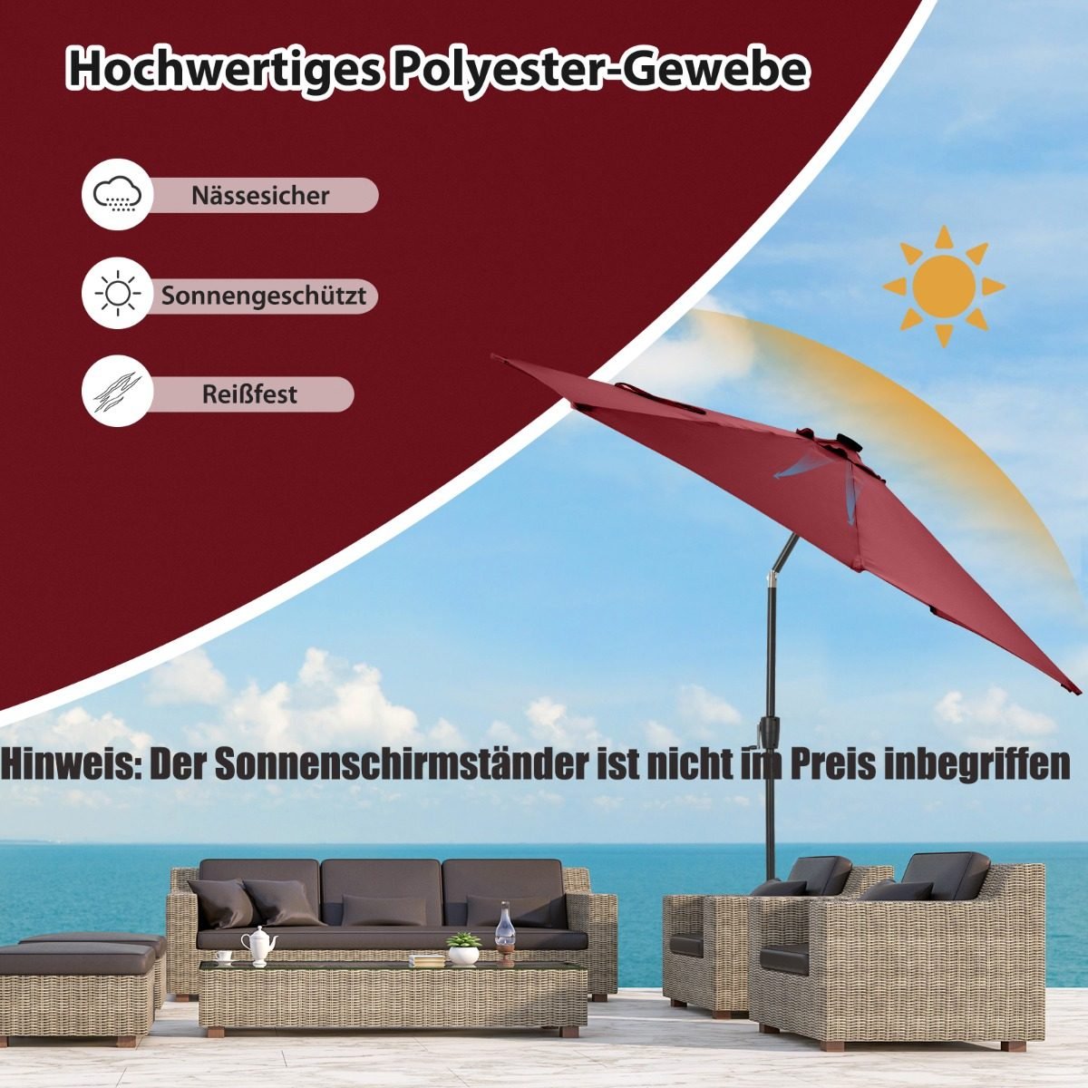 Pagerinkite savo lauko poilsį su šiuo elegantišku ir funkcionaliu sodo skėčiu. Jis ne tik suteikia platų pavėsio plotą jūsų kieme ar terasoje, bet ir sukuria magišką atmosferą vakare dėl integruotų LED lempučių.