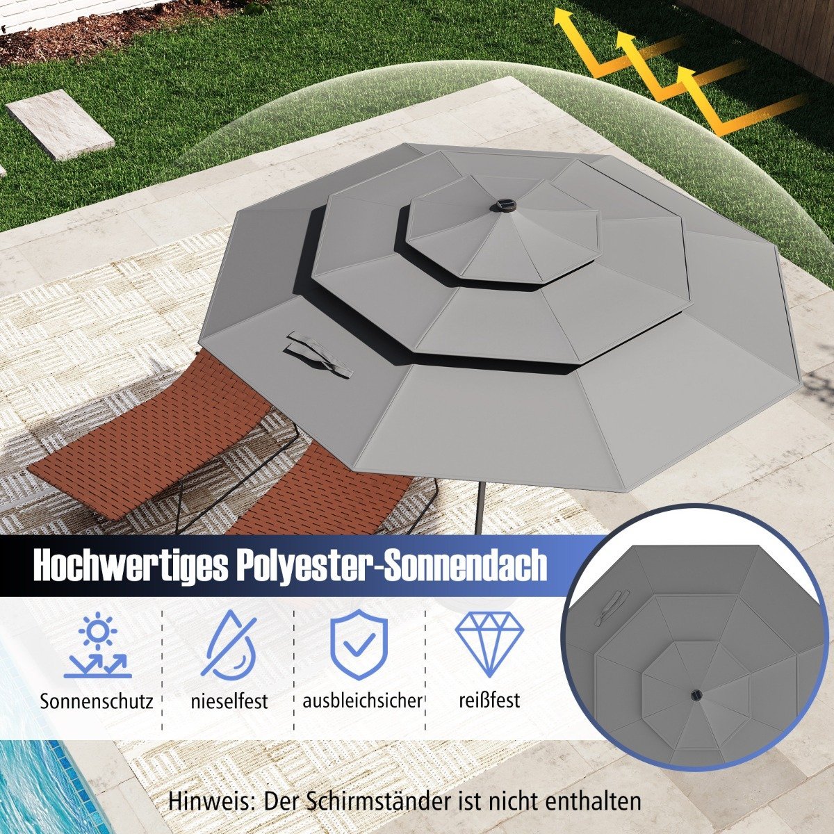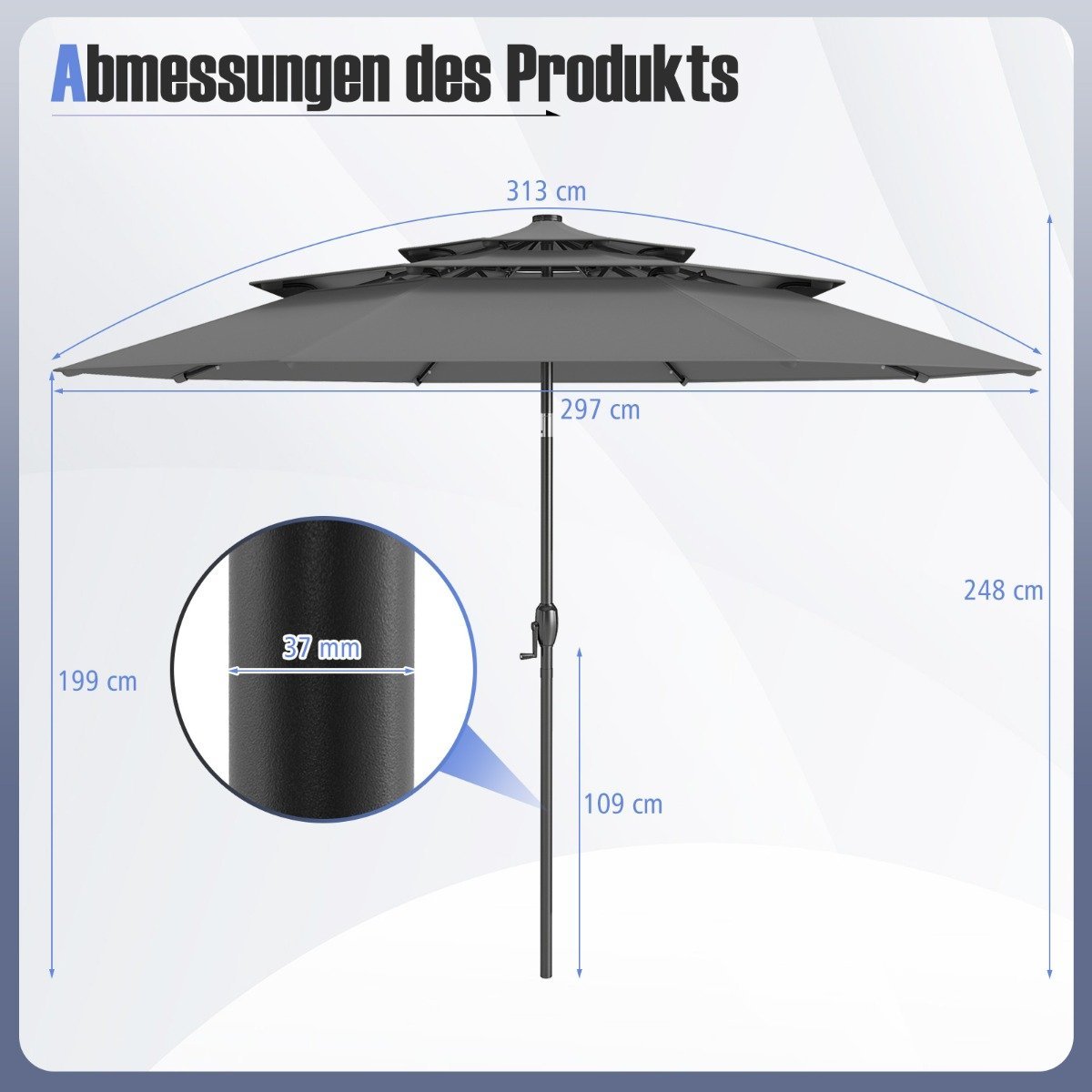 Pagerinkite savo lauko erdvę su šiuo moderniu ir funkcionaliu sodo skėčiu. Jo patvarus dizainas ir patogios naudojimo savybės leis Jums be rūpesčių mėgautis saulėtomis dienomis.
