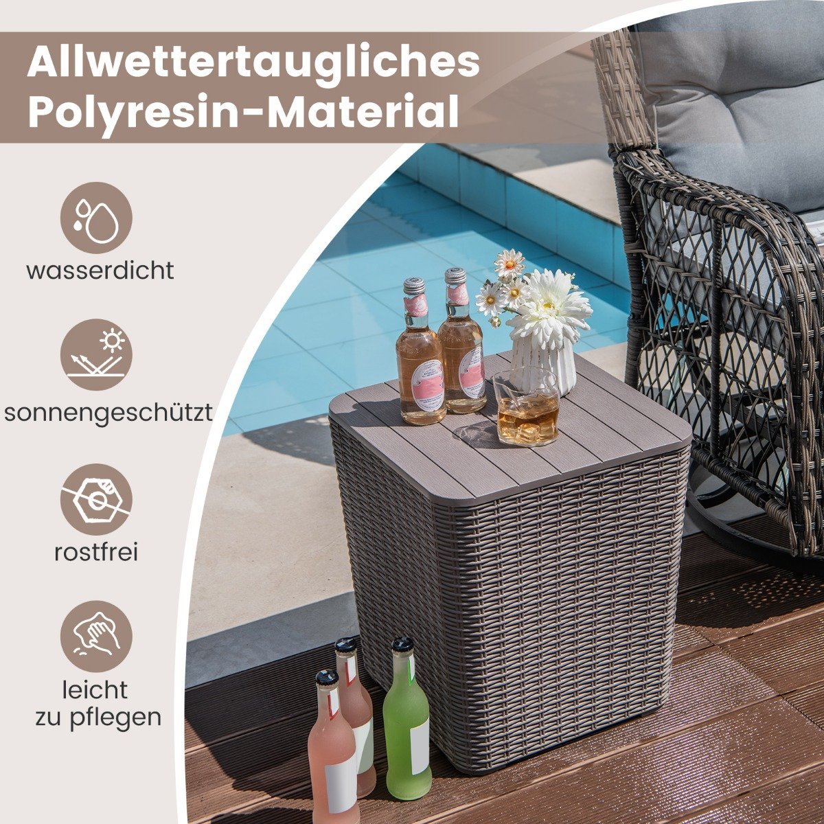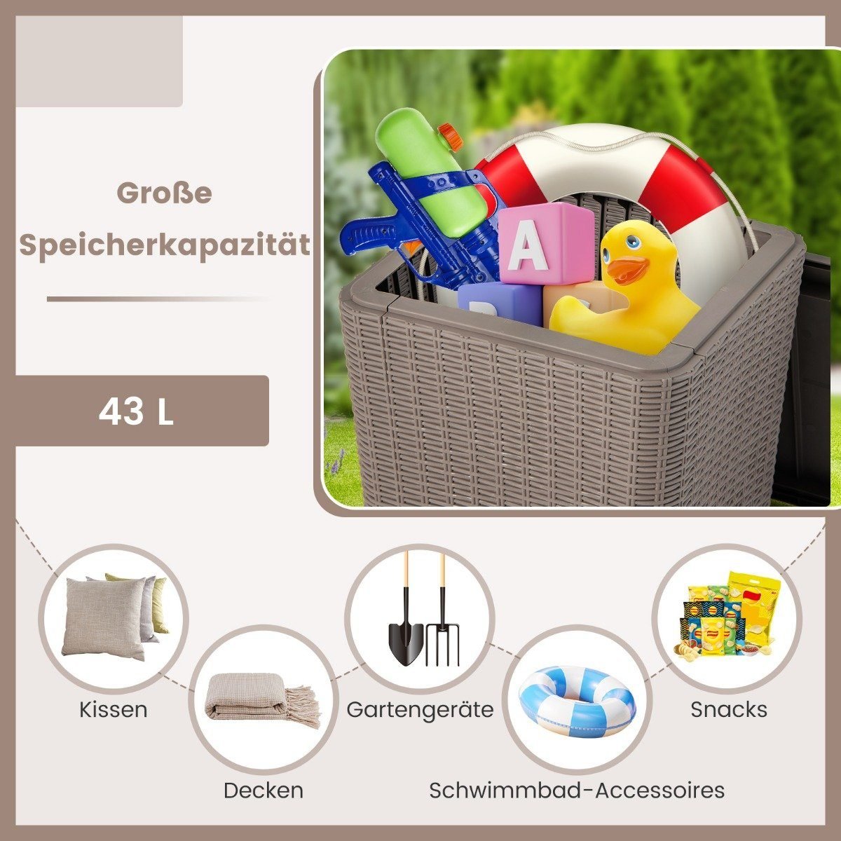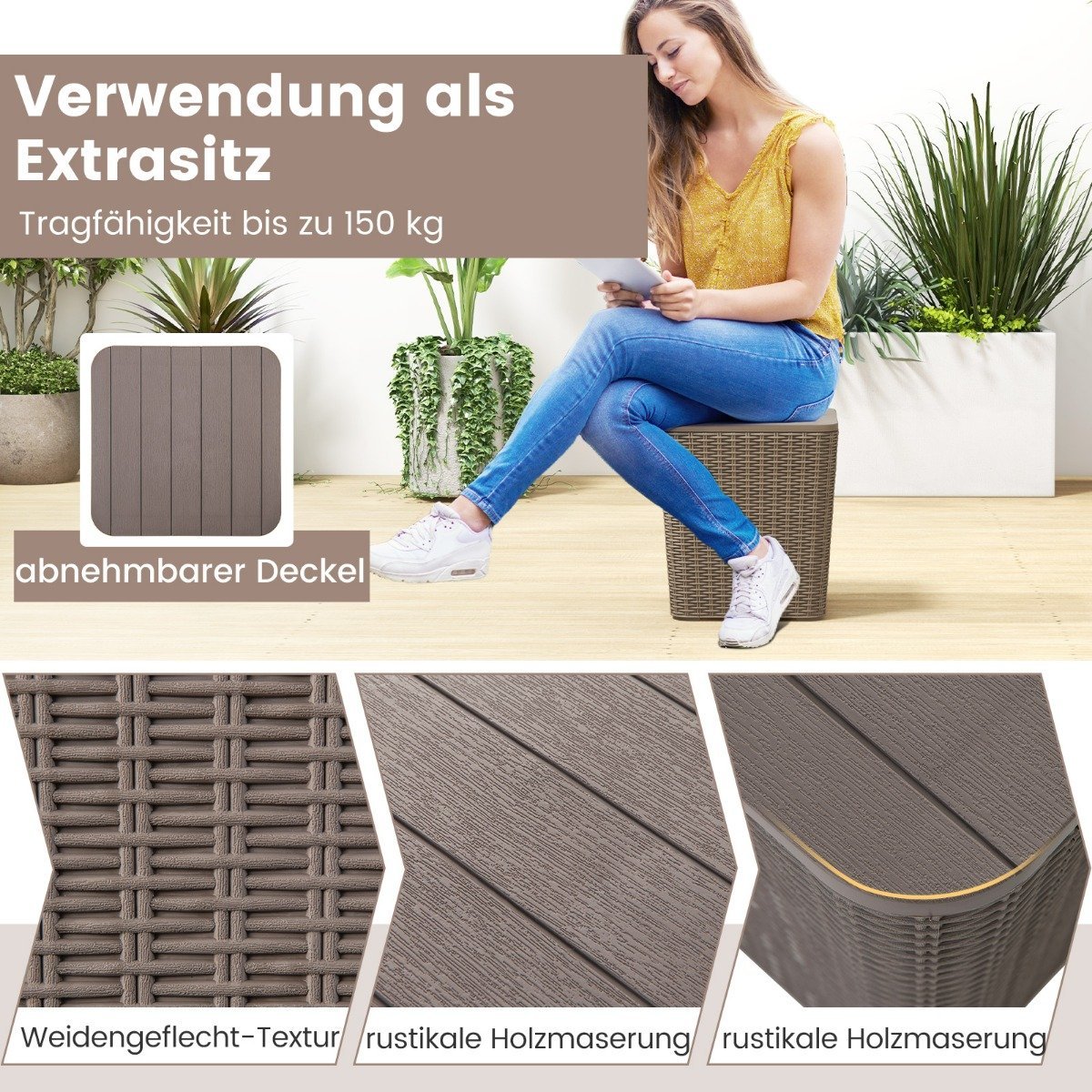 Padidinkite savo lauko erdvės funkcionalumą ir stilių su šiuo universaliu sodo baldu. Jis puikiai atliks ne tik staliuko, bet ir patogaus suoliuko bei talpios daiktadėžės jūsų lauko reikmenims laikyti funkcijas.
