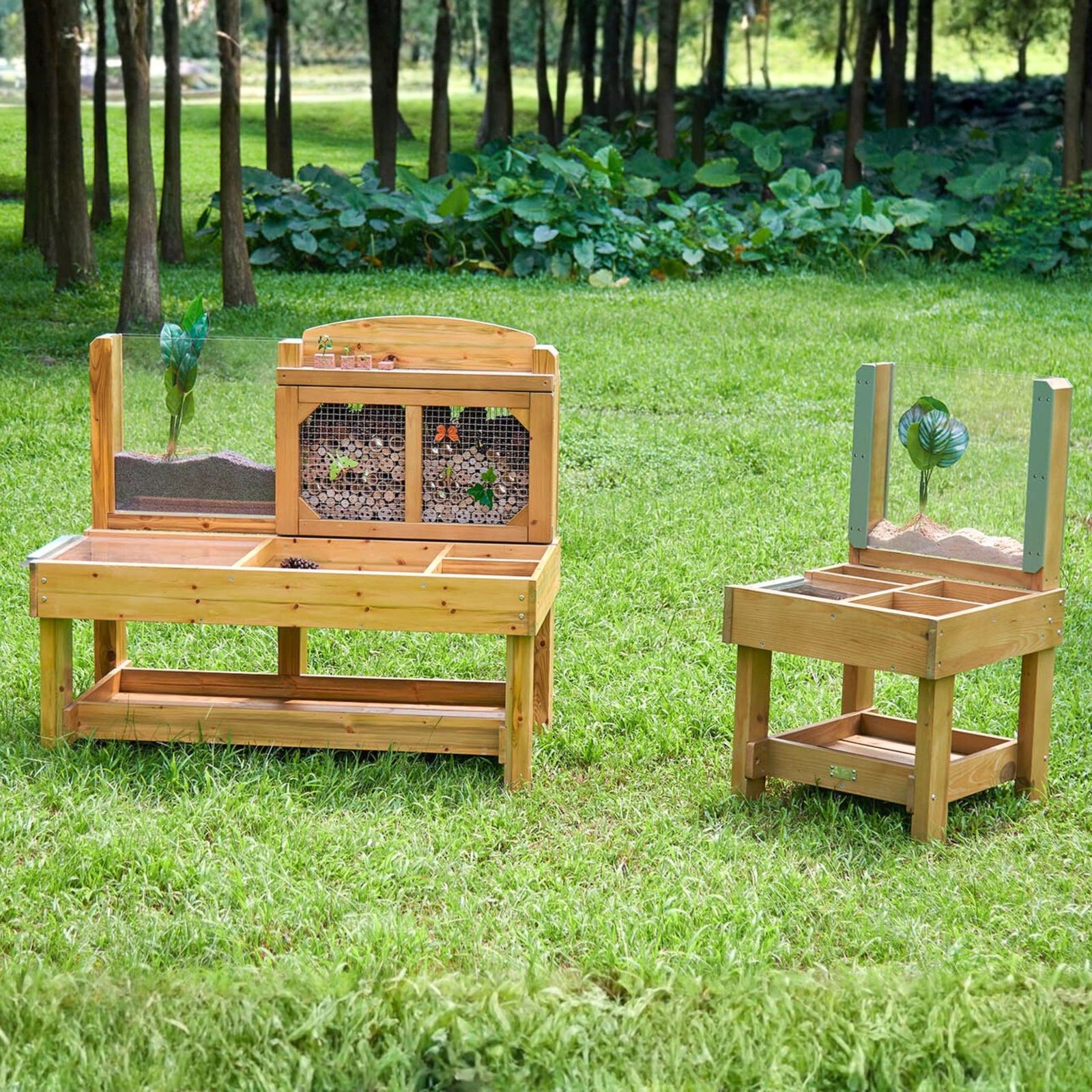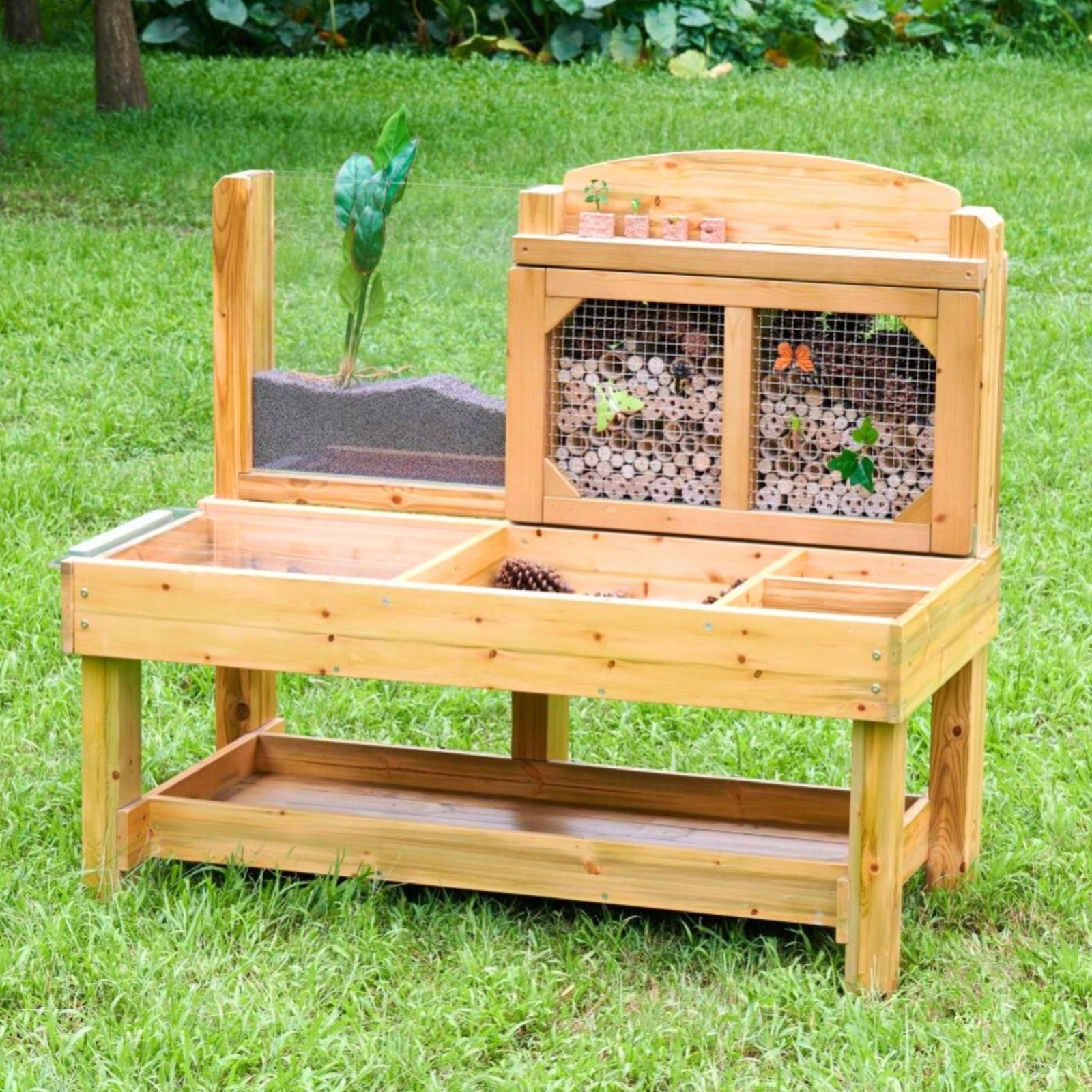 Šis praktiškas stalas sukurtas gamtai stebėti ir laukinę gyvūniją į sodą vilioti. Jo paviršius padalintas į įvairias zonas gamtos radiniams rinkti: mažesnės sekcijos skirtos medžio žievei, drožlėms, didesnės – medienos gabalėliams, lapams ir kitiems radiniams. Stebėjimo zonoje rasite permatomų, išimamų indų mėginiams rinkti, bei didelę talpyklą su permatomu dangteliu gyviems egzemplioriams stebėti (pavyzdžiui, sraigei, judančiai akrilo paviršiumi).