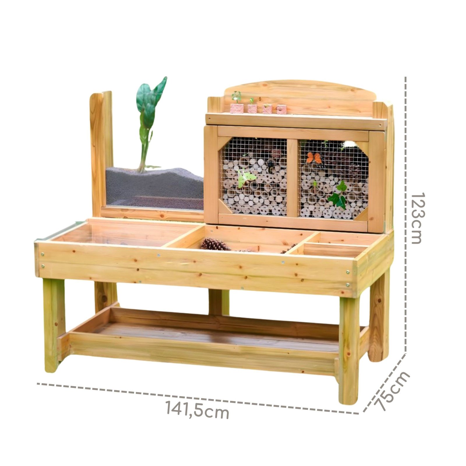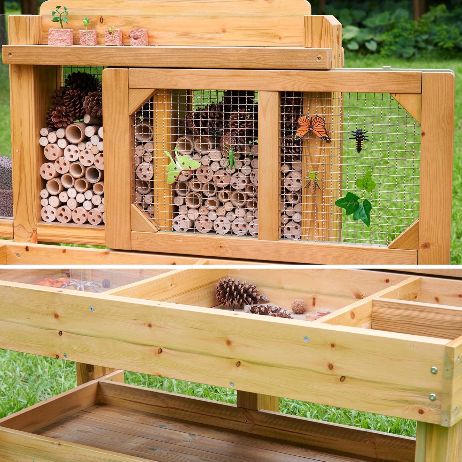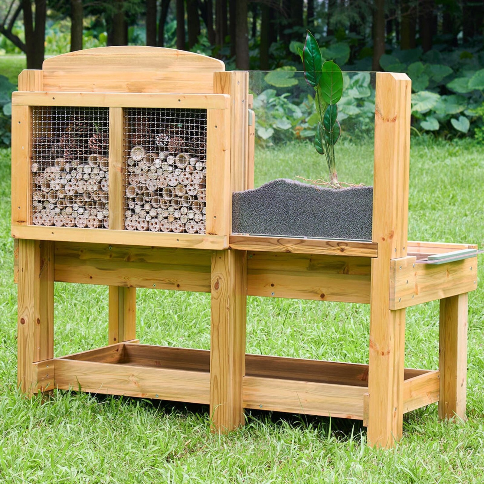 Galinė sienelė su mediniais vamzdeliais, uždengtais plieniniu tinkleliu, vilioja ir priglaudžia vabzdžius. Papildomas akrilo konteineris leidžia stebėti šaknų vystymąsi, augalų augimą ar kirminų judėjimą natūralioje aplinkoje – tai puiki patirtis mažiems tyrinėtojams!