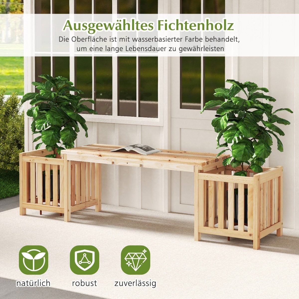 Ieškote universalaus sodo baldo, kuris sujungtų sėdėjimo ir augalų auginimo galimybes? Šis 2-in-1 daugiafunkcis dizainas apima patogią dvivietę suolą ir du atvirus vazonus, puikiai tinkančius įvairaus ilgio šaknims. Pagaminta iš tvirtos eglės medienos, padengtos vandens pagrindo laku, ši suolė suteikia plačią, ventiliuojamą lamelių sėdimąją dalį, atlaikančią iki 300 kg. Natūrali išvaizda puikiai dera įvairiose erdvėse, tokiose kaip terasos ir sodai.