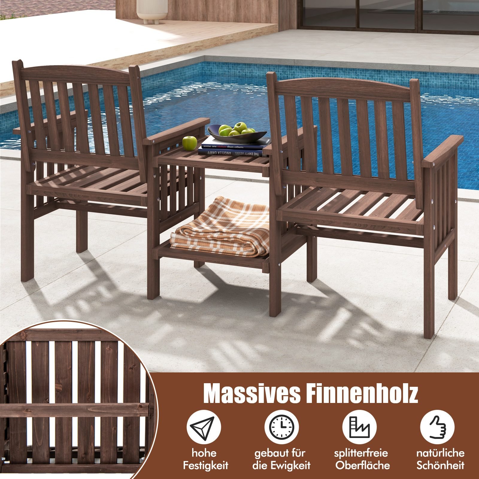 Atraskite funkcionalumo ir stiliaus harmoniją su mūsų sodo suolu, kuris vienija 2 kėdes su atlošais ir porankiais bei 2 pakopų staliuką į vientisą, elegantišką dizainą. Pagamintas iš tvirtos pušies medienos, šis lauko baldas ne tik pasižymi ilgaamžiškumu, bet ir suteikia nesenstančio žavesio bet kokiai lauko erdvei.