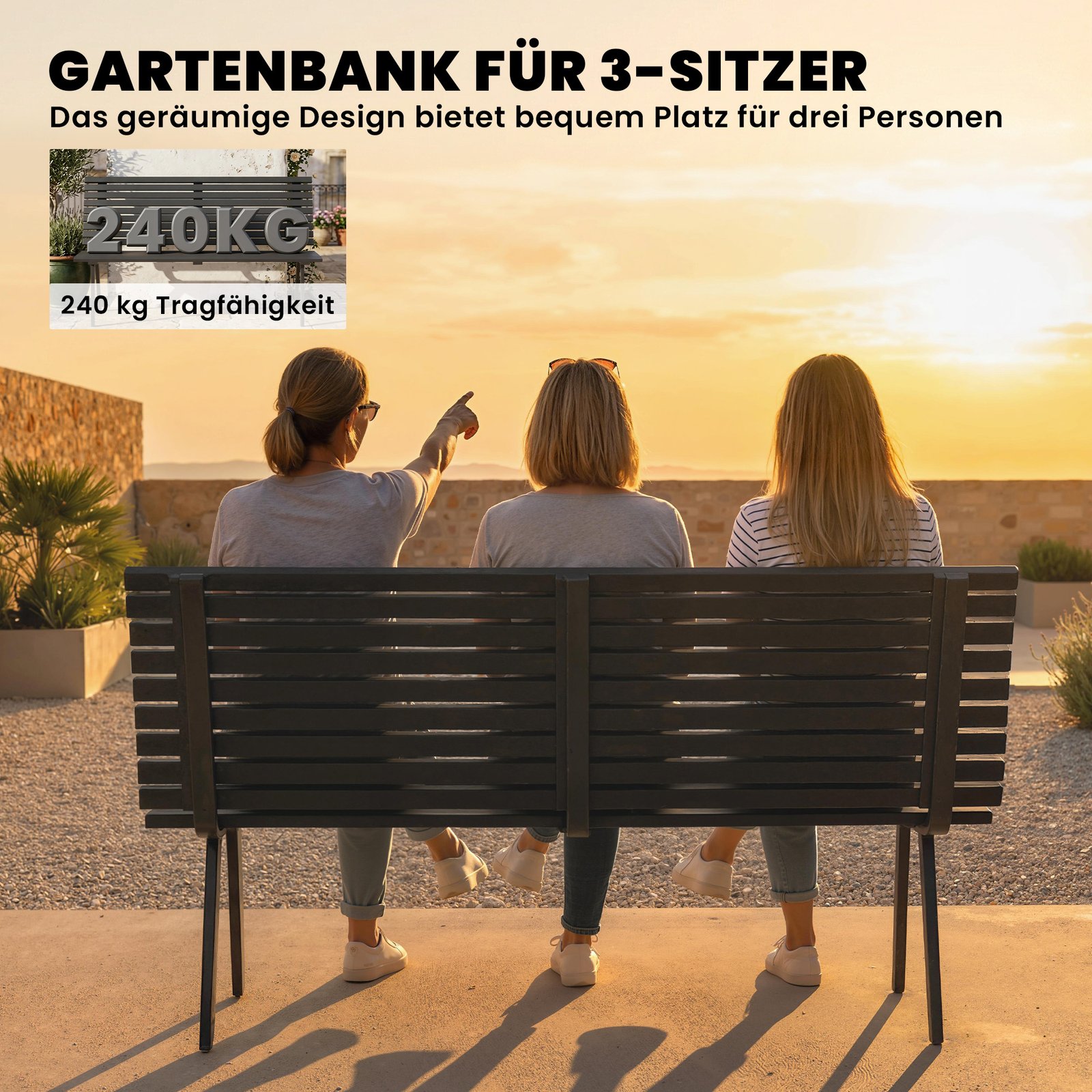 Jūsų sodas yra jūsų oazė, tačiau bendros vietos visiems dažnai trūksta. Svyruojančios, ankštos sėdėjimo vietos neturi būti! Šis sodo suoliukas su tvirtu metaliniu rėmu išlaiko iki 240 kg ir talpina tris asmenis. Šis elegantiškas juodas terasos suoliukas sujungia stilių ir komfortą, kad galėtumėte mėgautis atsipalaidavusiomis akimirkomis ir nepamirštamais prisiminimais su savo artimaisiais.