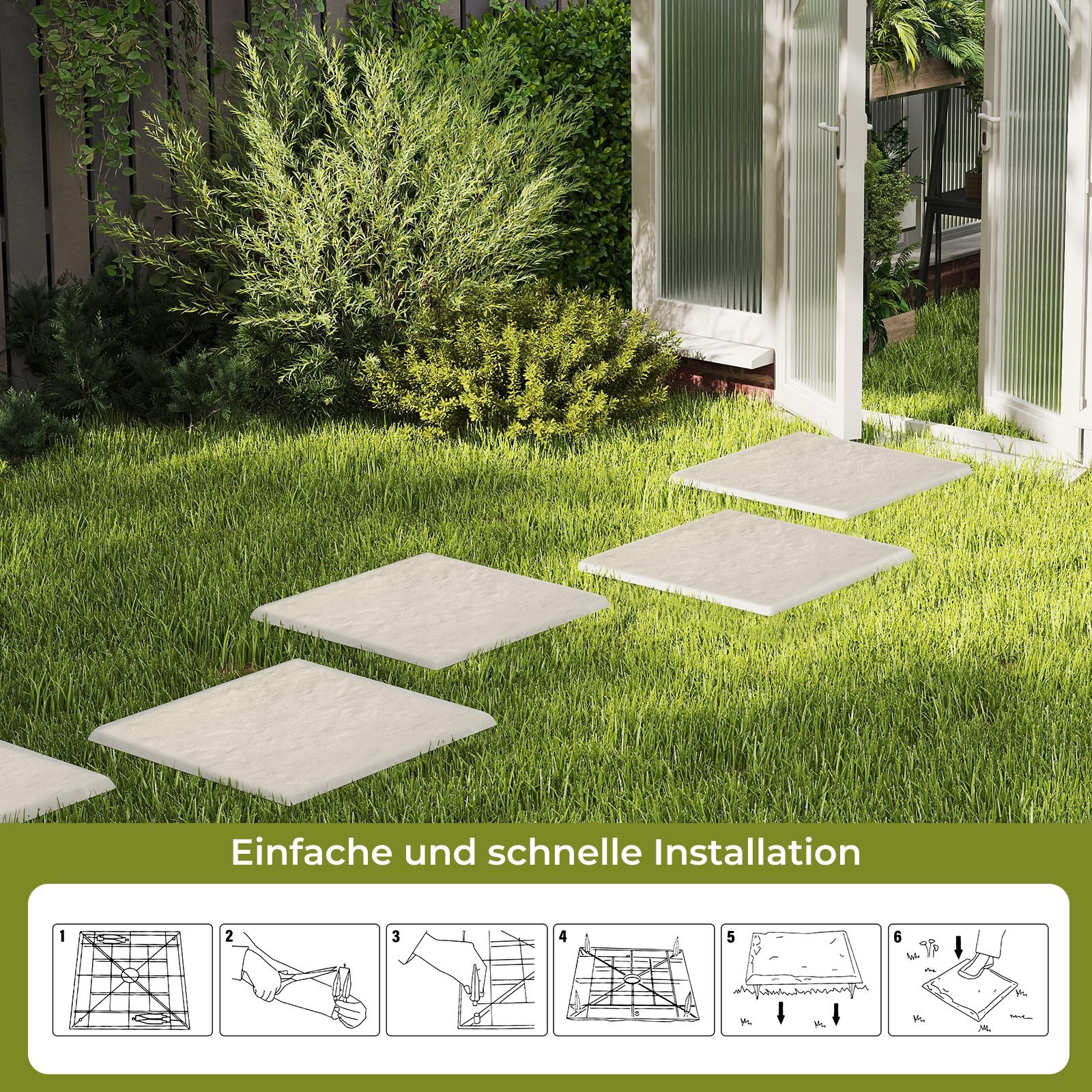 Pagerinkite savo sodo estetiką ir funkcionalumą su mūsų sodo takelių akmenimis. Šios dekoratyvinės takelių plokštės pagamintos iš oro sąlygoms atsparios PP medžiagos, todėl jos atlaikys blukimą, įtrūkimus ir saulės žalą, užtikrinant ilgalaikį naudojimą lauke. Kiekviena 39,5 x 39,5 cm dydžio plokštė yra lengva ir sukurta vizualiai formuoti takus, suteikiant jūsų vejai ar kiemui struktūros ir rafinuotumo.