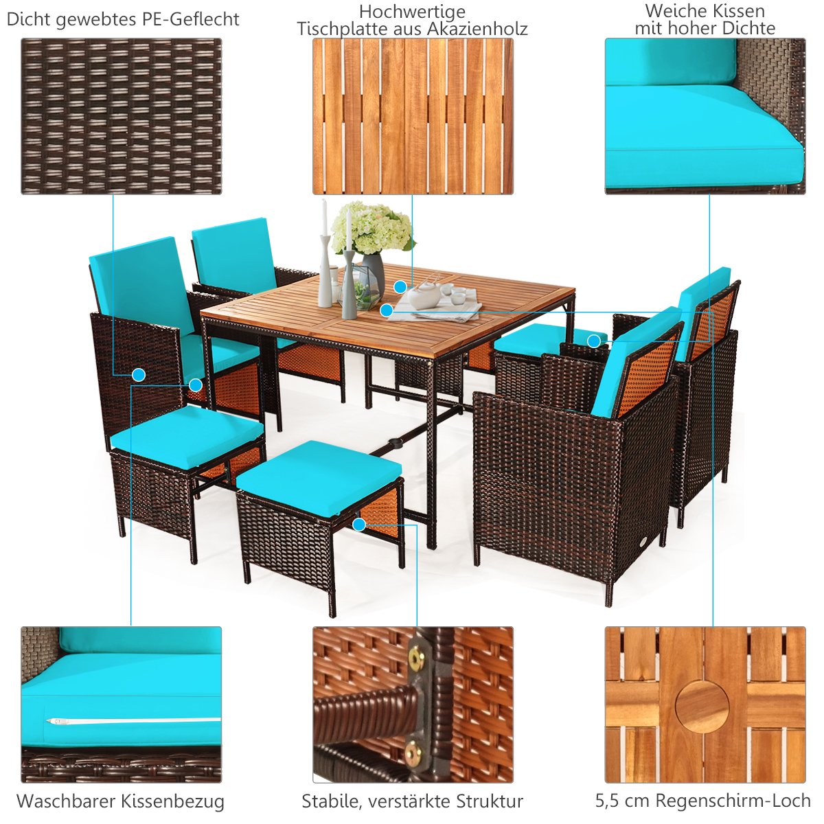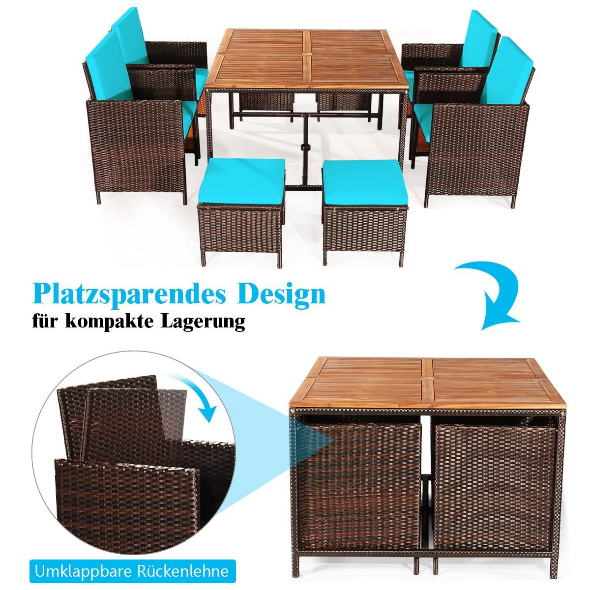 - Medžiaga: PE rotango, plienas, akacijos mediena, poliesteris, putų užpildas
