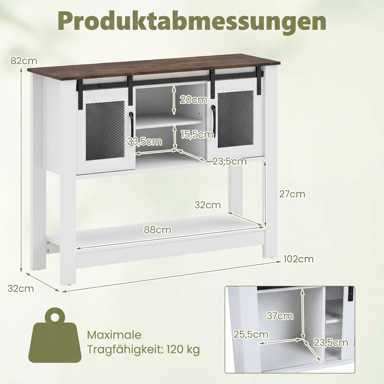 - Apatinės lentynos matmenys (I x P x A): 88 x 32 x 27 cm