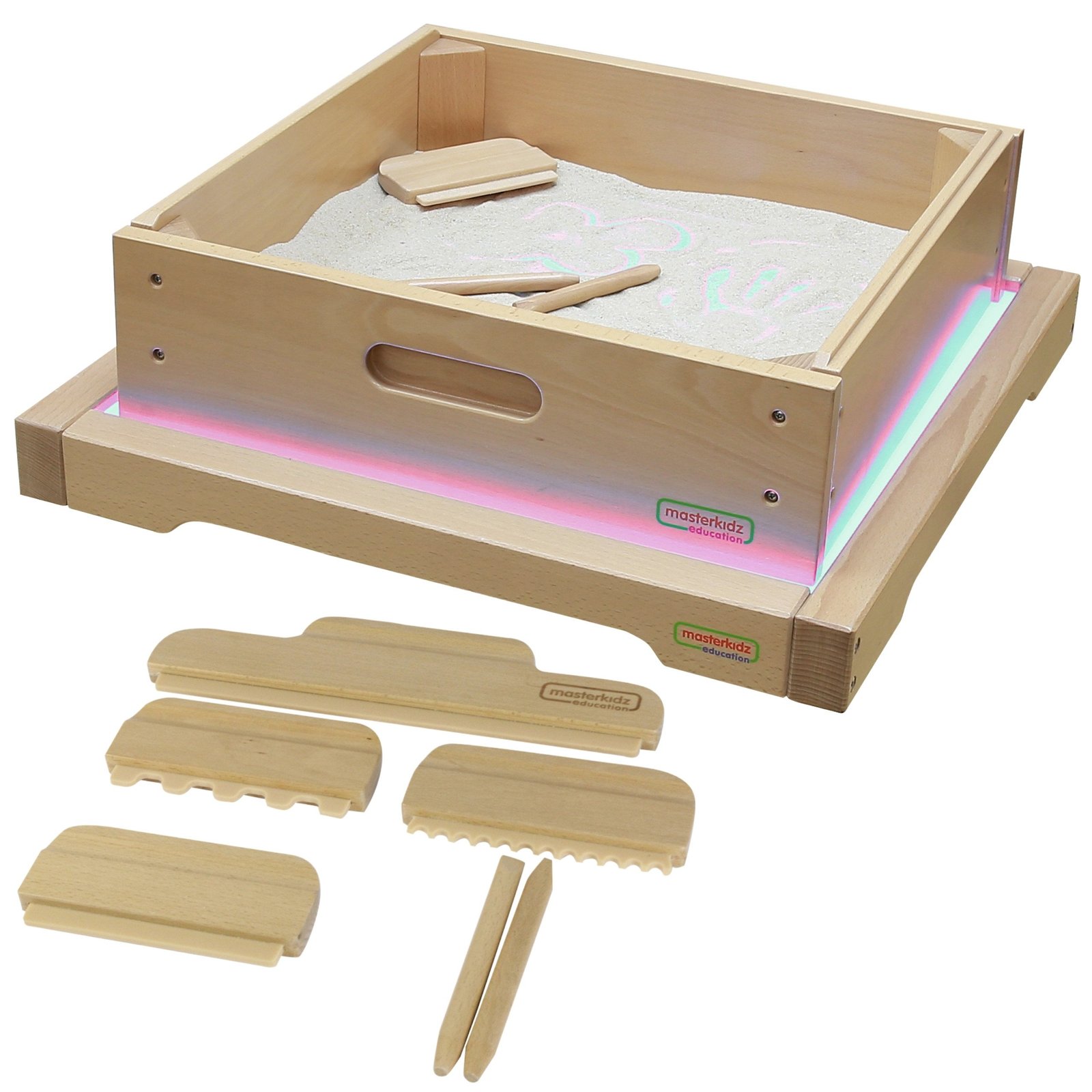 „Masterkidz“ LED sensorinė šviesos dėžė yra tvirta medinė dėžė su LED apšvietimu, skleidžiančia spalvingą šviesą. Komplekte esantis nuotolinio valdymo pultelis leidžia pasirinkti vieną iš 11 iš anksto nustatytų spalvų arba rankiniu būdu keisti spalvas, derinant pagrindines šviesos spalvas: raudoną, žalią ir mėlyną. Ši dėžė taip pat leidžia sklandžiai keisti spalvas ir išsaugoti pasirinktas, kad jas būtų galima naudoti pakartotinai.