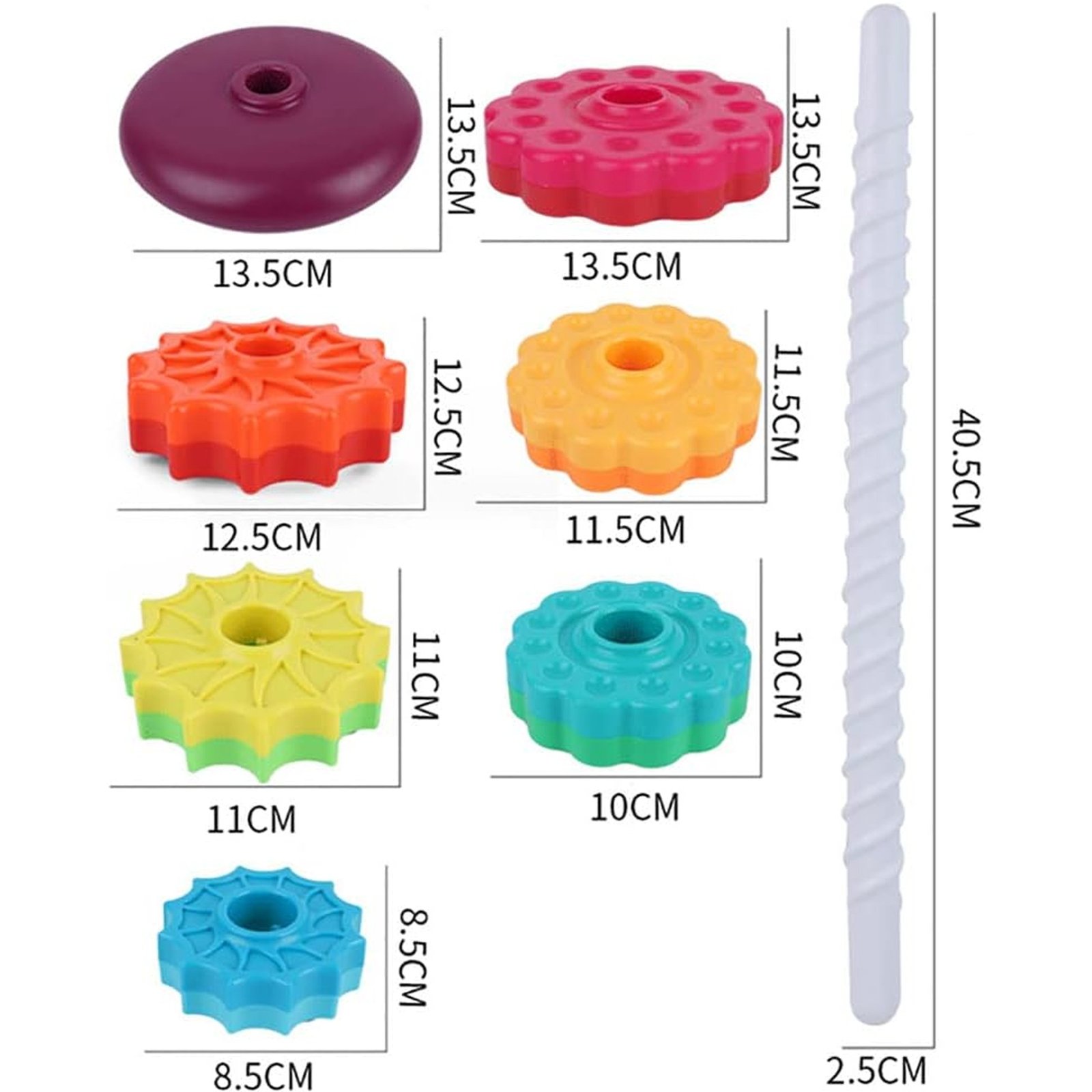 Rinkinį sudaro 6 skirtingų spalvų ir formų diskeliai bei ant pagrindo tvirtinamas strypas. Šio bokšto surinkimas padeda lavinti vaiko loginį mąstymą ir veiksmų planavimą.
