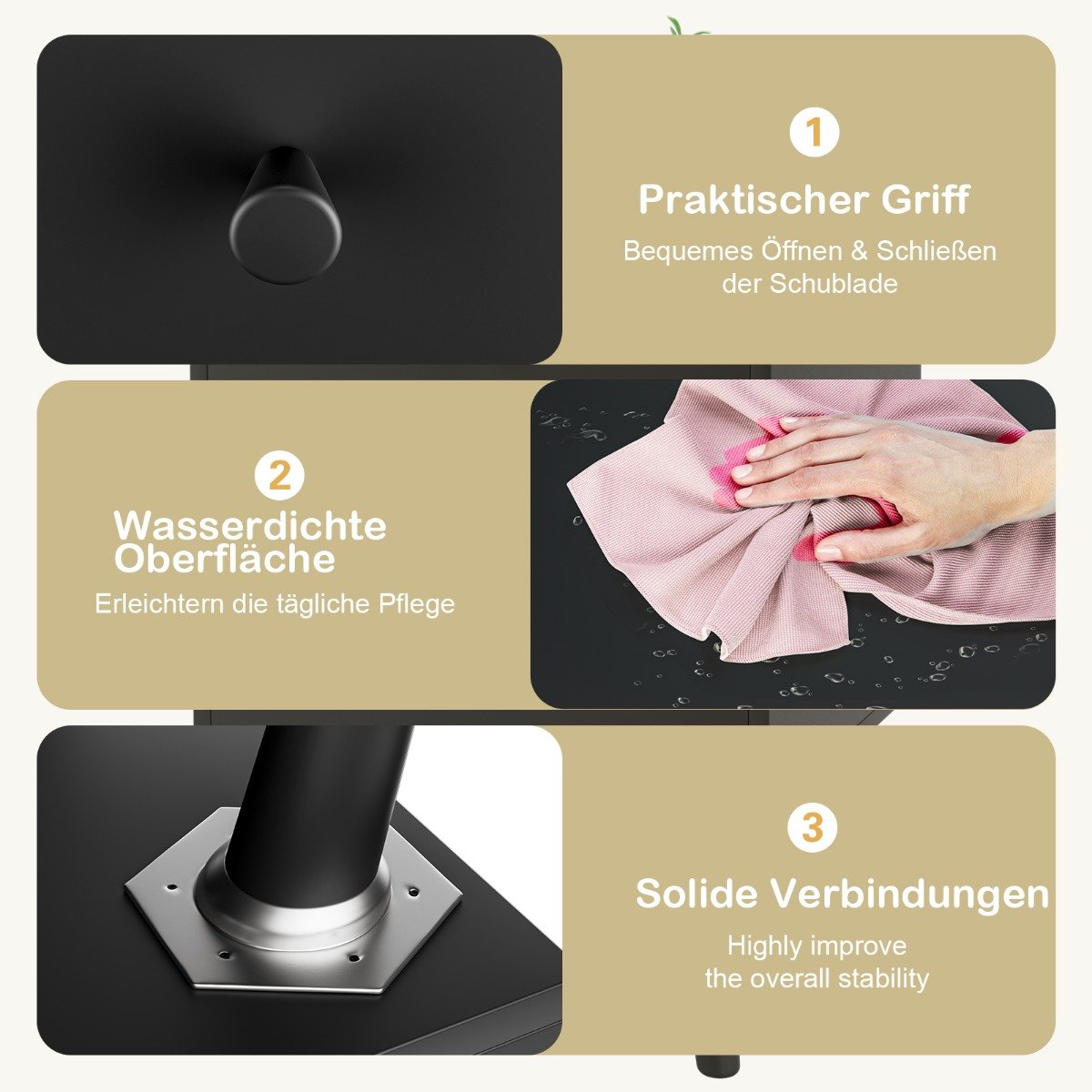 Ši naktinė spintelė – puikus modernaus Jūsų namų interjero priedas, suteikiantis praktiškumo ir pakankamai vietos smulkiems daiktams laikyti. Aptakios rankenėlės ir sklandžiai veikiantys bėgeliai leidžia stalčius atidaryti be pastangų.
