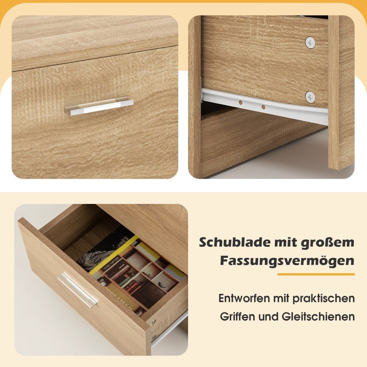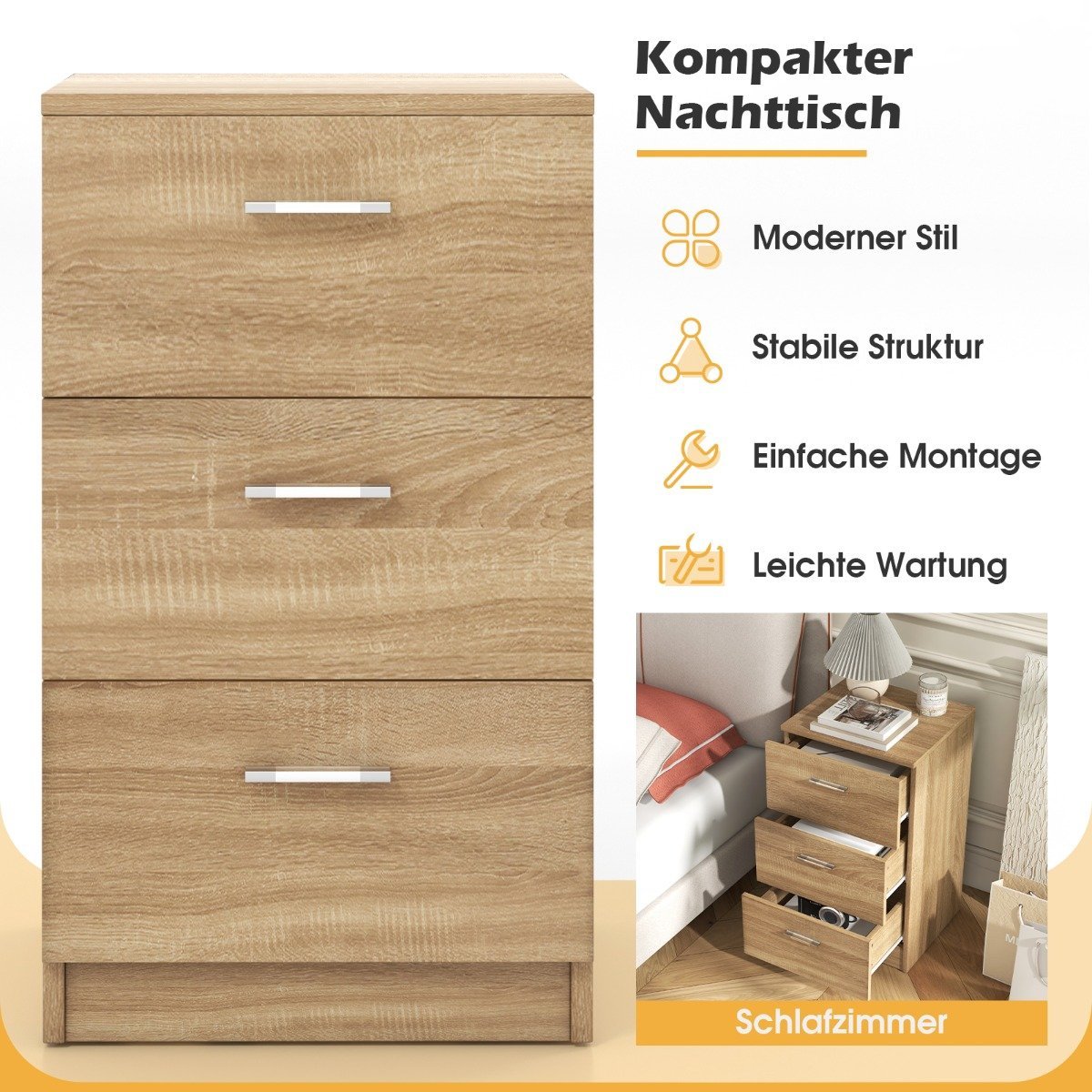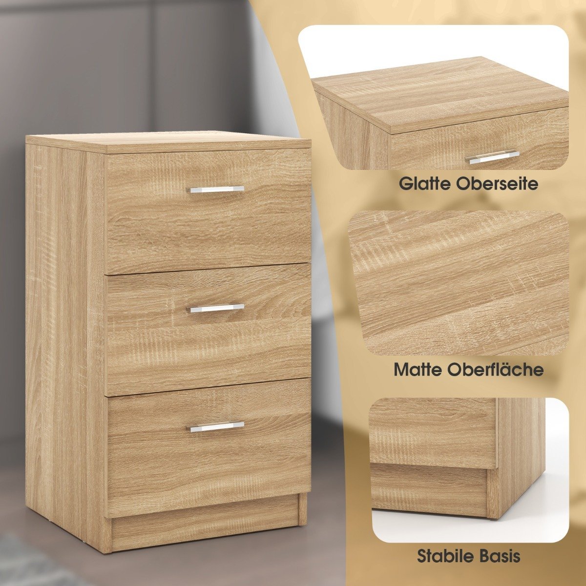 Ši naktinė spintelė – puikus pasirinkimas jūsų miegamajam ar svetainei. Pagaminta iš aukštos kokybės medžio drožlių plokštės, ji yra tvirta, lengvai prižiūrima ir ilgaamžė. Spintelė turi tris talpius stalčius, kuriuose galėsite tvarkingai laikyti kasdienius daiktus, knygas ar dekoracijas.