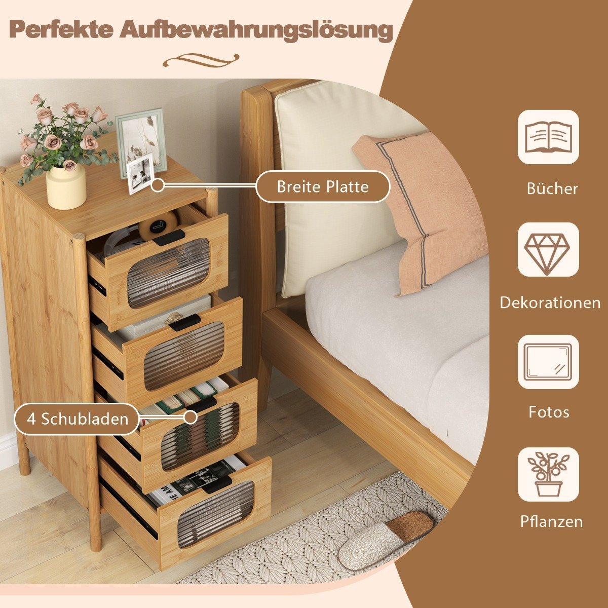 Spintelė su 4 bambuko stalčiais ir grūdintu stiklu (Natūrali)