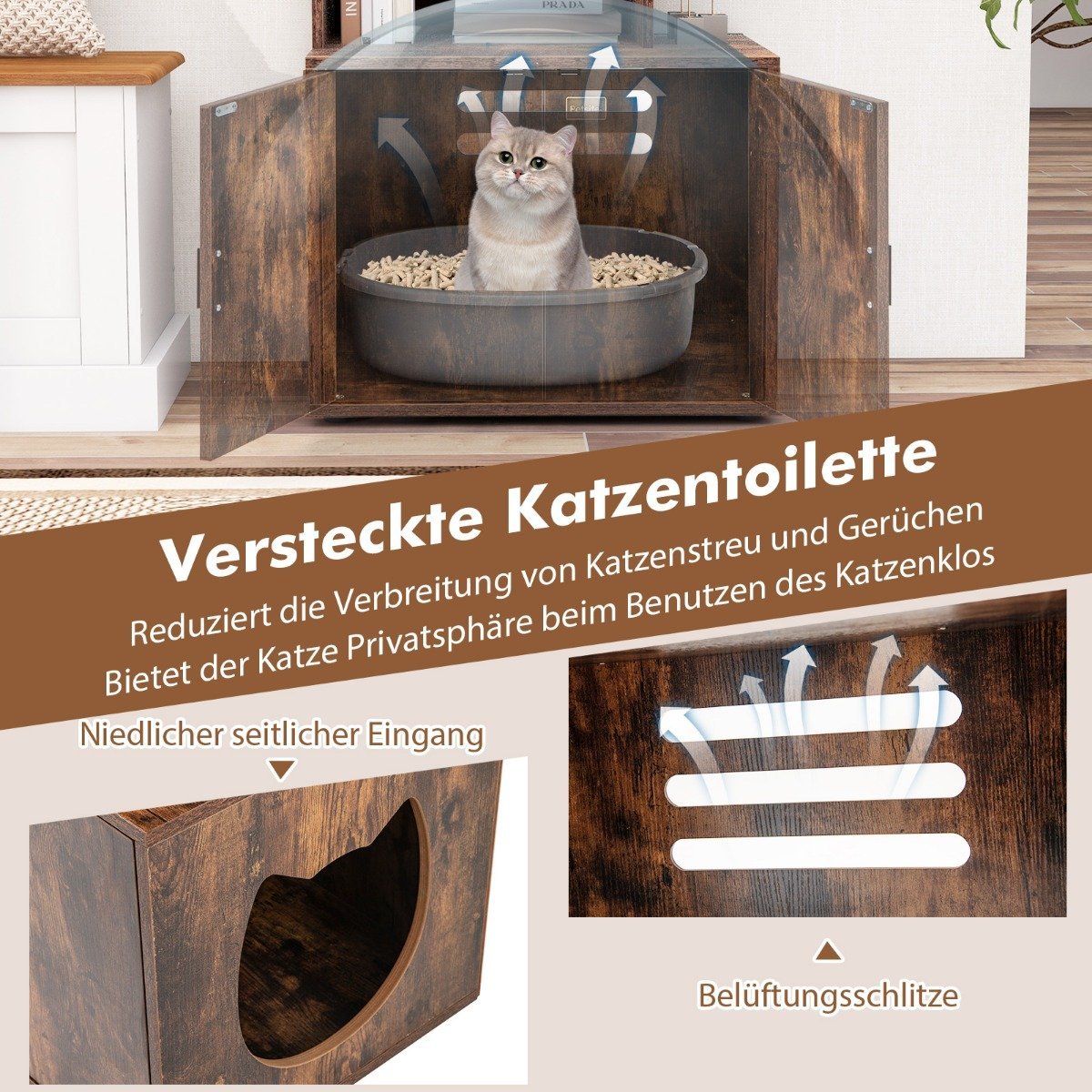 Užtikrinkite savo katei privačią ir tvarkingą erdvę su šia patogia spintelė-narveliu. Uždaras skyrius padeda sumažinti kvapus ir išsibarsčiusį kraiką, o atviros lentynos suteikia vietos viskam, ko reikia jūsų augintiniui.