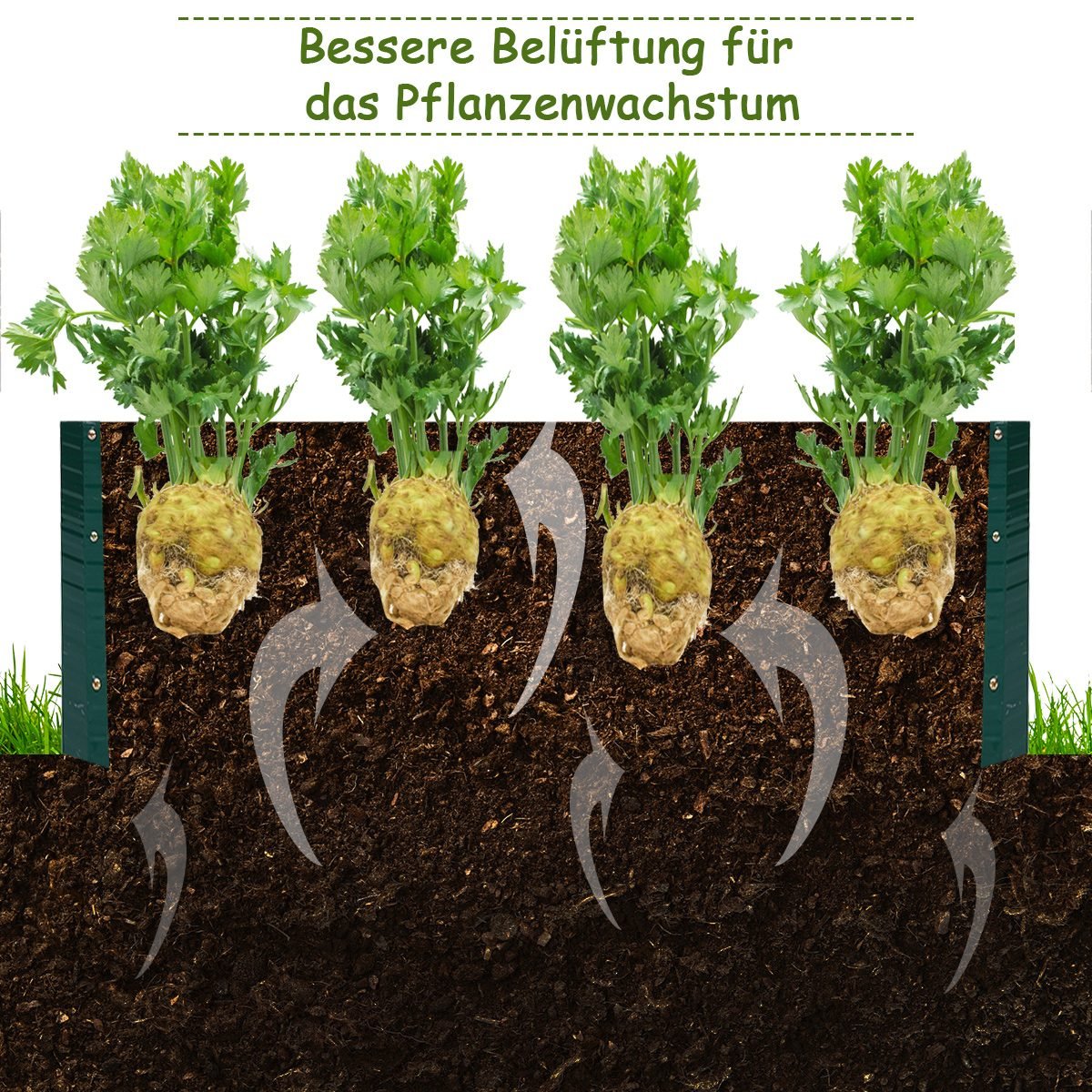 - Suteikia pakankamai erdvės augalų šaknims vešėti.