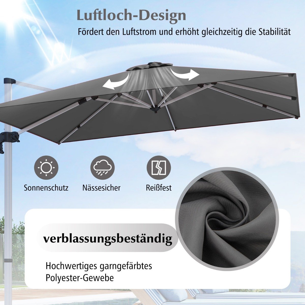 Šis didelis 300×300 cm skėtis nuo saulės, sukurtas jaukiai ir moderniai lauko erdvei, suteikia platų pavėsinį plotą, tinkantį įvairioms veikloms. Lengvai pasukamas 360° kampu ir reguliuojamas 5 skirtingose pozicijose, jis užtikrina optimalią apsaugą nuo saulės visą dieną. Aukštos kokybės, spalvos nekeičiantis poliesterio audinys garantuoja ilgaamžiškumą.