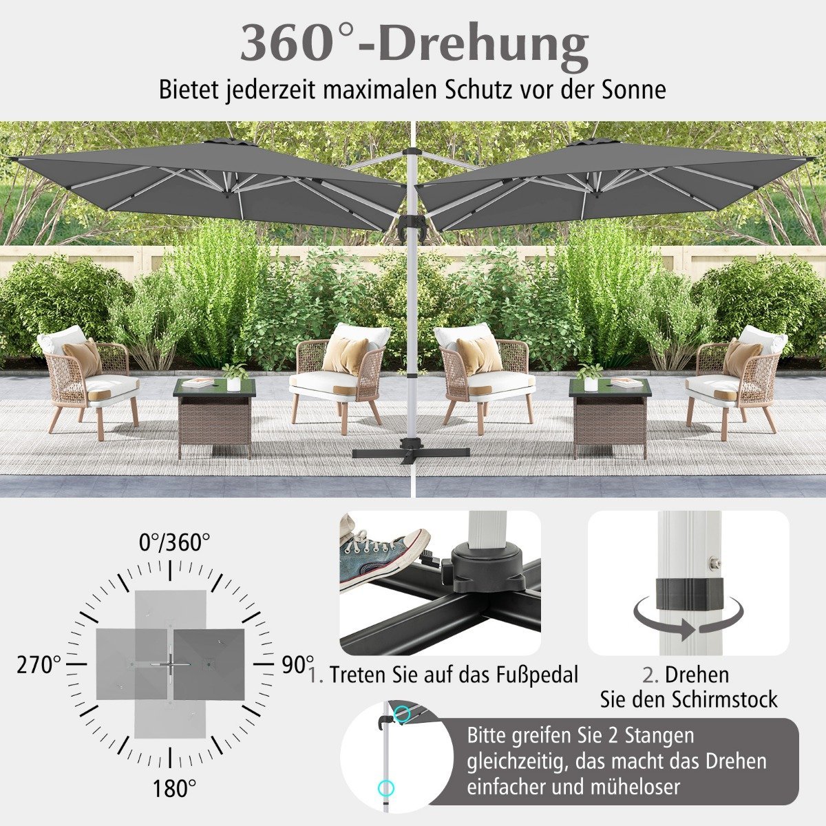 - Sukamas 360°, kad visada užtikrintų maksimalią apsaugą nuo saulės.