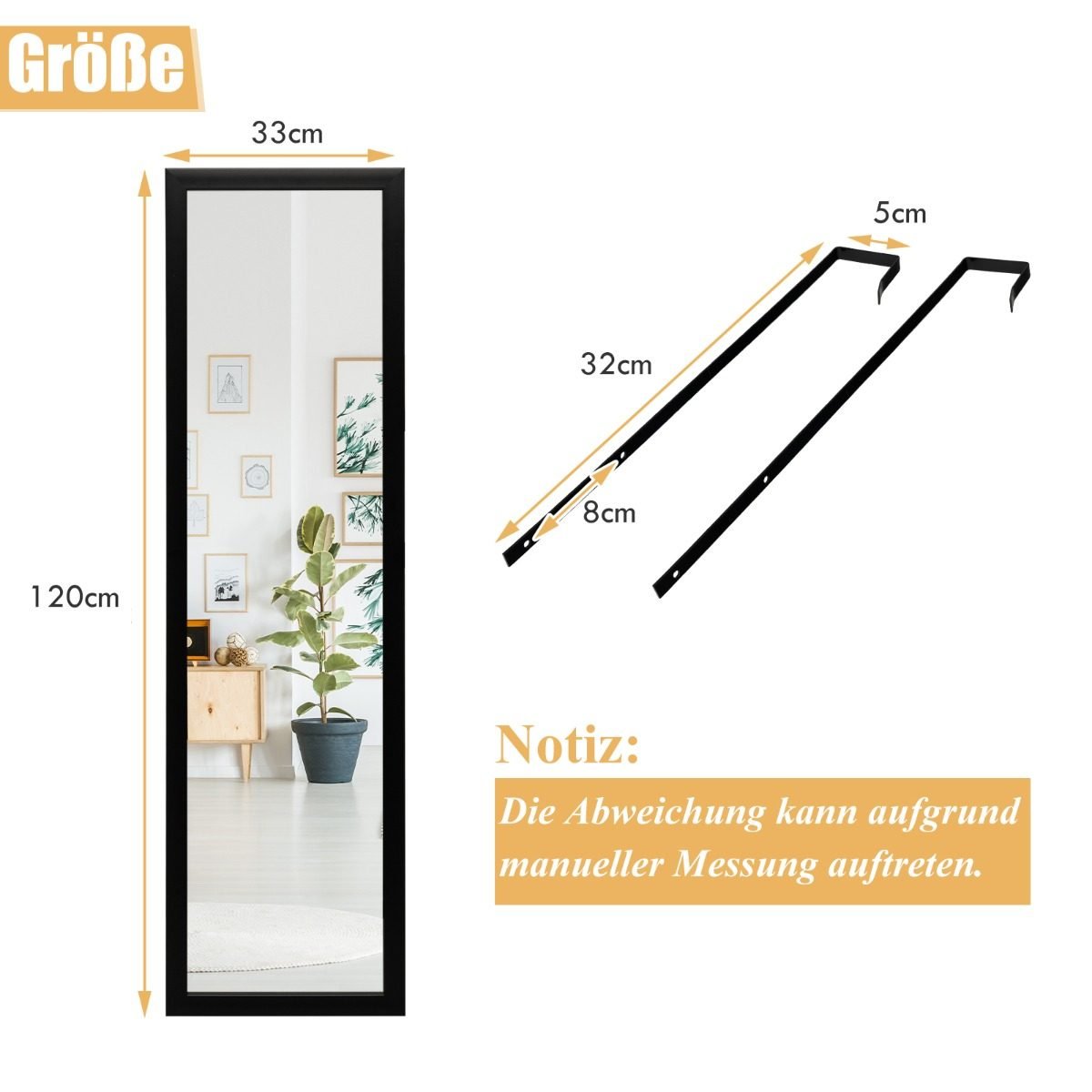 - Viso kūno veidrodis: 33 x 119 cm dydis leidžia patogiai matyti visą savo figūrą.