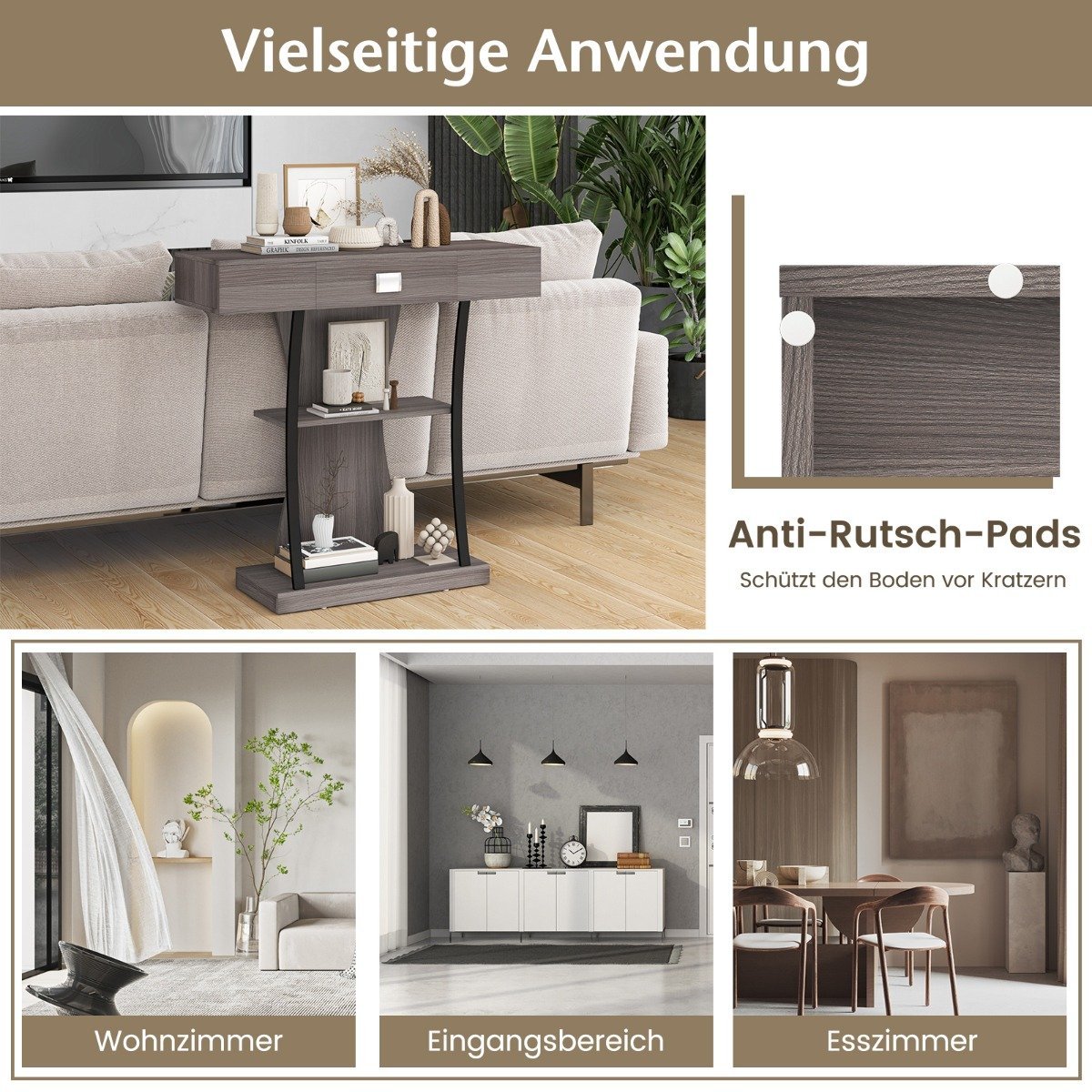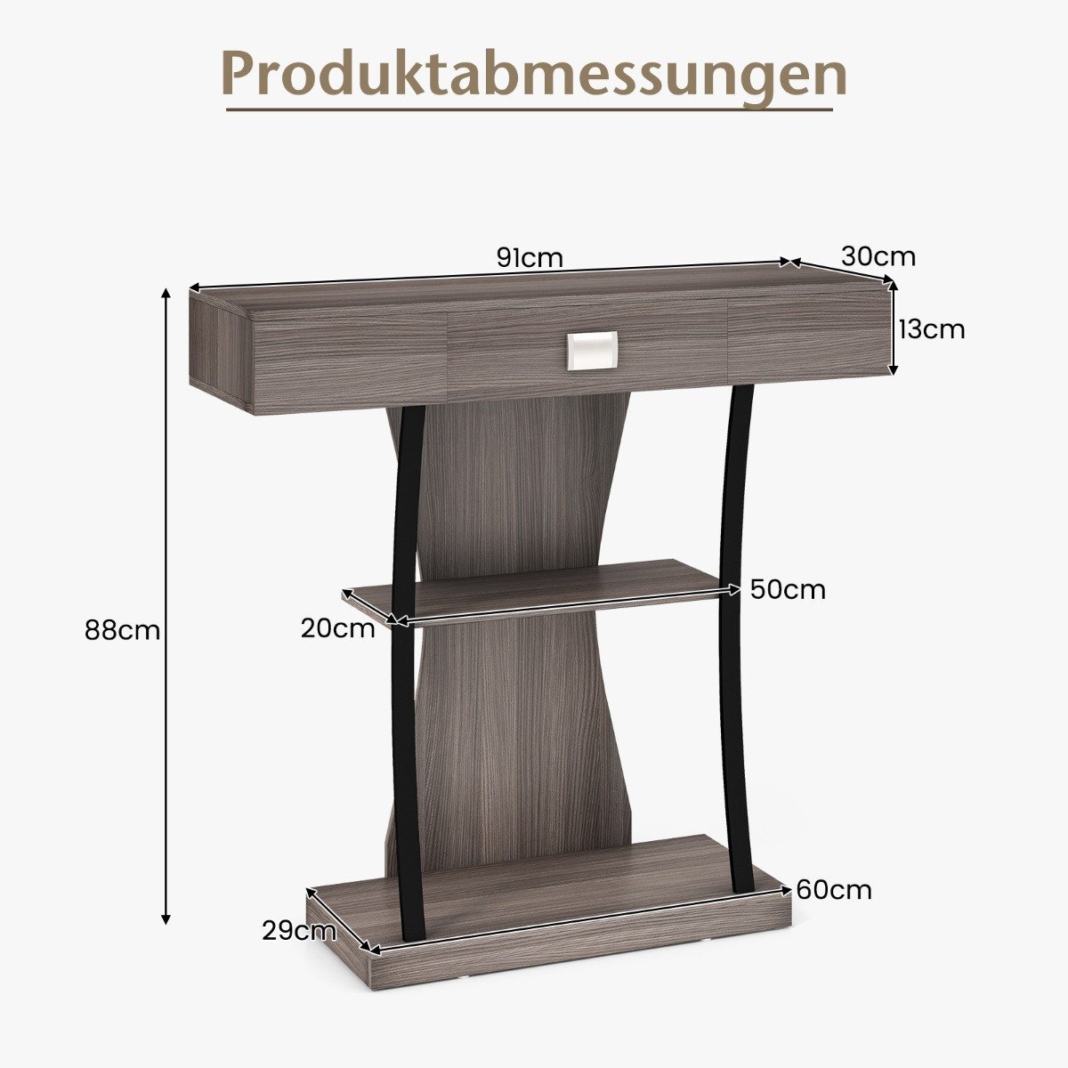 Papuoškite savo namus stilingu konsoliniu stalu, kuris suteiks jūsų aplinkai daugiau žavesio. Šis trijų pakopų juodas staliukas su stalčiumi ne tik puikiai tinka daiktams laikyti, bet visų pirma tarnauja kaip stilingas interjero elementas. Pakopinė lentynų konstrukcija ir šiek tiek lenkti metaliniai atraminiai vamzdžiai puikiai užpildo erdvę nuo viršaus iki apačios, suteikdami baldams išskirtinumo ir lengvumo. Skaidri medienos struktūra paviršiuje pabrėžia natūralų raštą. Dėl plataus pagrindo šis išraiškingas prieškambario stalas stabiliai stovės net intensyviai naudojamose patalpose, tokiose kaip prieškambaris ar koridorius. Prireikus, jį galima papildomai pritvirtinti saugos dirželiu.