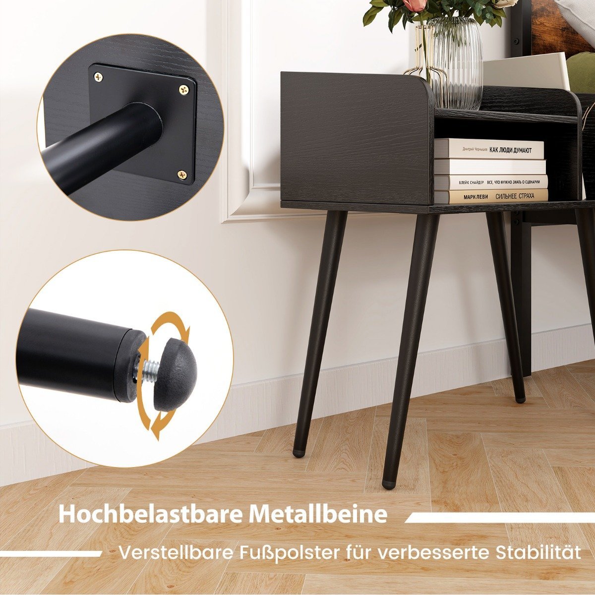 Padovanokite savo miegamajam stiliaus ir funkcionalumo derinį su šiuo moderniu naktiniu staliuku. Jo dviejų lygių atvira saugojimo sistema ir šoninė lentynėlė užtikrina patogų daiktų laikymą ir lengvą prieigą. Pakeltas dizainas palengvina grindų valymą, o tvirtos metalinės kojelės su reguliuojamais padėklais suteikia stabilumo net ant nelygių paviršių.