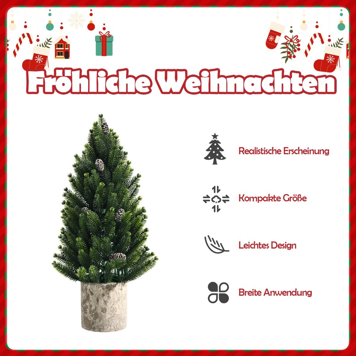 Neturite vietos didelei kalėdinei eglutei? Mūsų 47 cm aukščio stalinė eglutė – puikus sprendimas! Dėl savo kompaktiško dizaino ji suteiks jūsų namams šventinę nuotaiką. Tankios PE šakelės ir 14 pušies kankorėžių atrodo itin natūraliai. Stabilus pagrindas užtikrina tvirtą stovėjimą. Eglutė jau paruošta, tereikės suformuoti šakeles, tad nereikės gaišti laiko sudėtingam montavimui.
