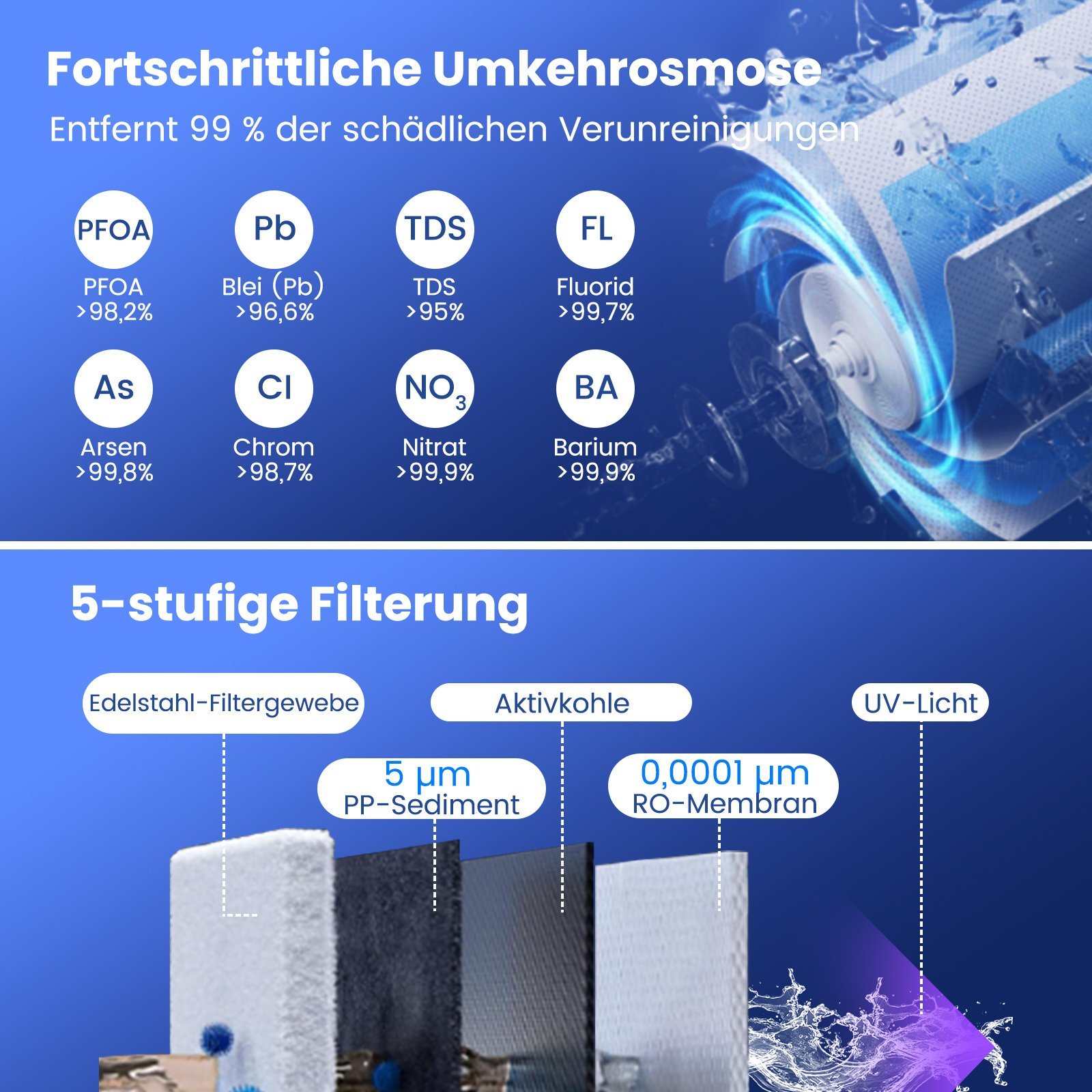 - Efektyviai pašalina daugiau nei 1000 priemaišų ir sumažina TDS lygį daugiau nei 95 %.