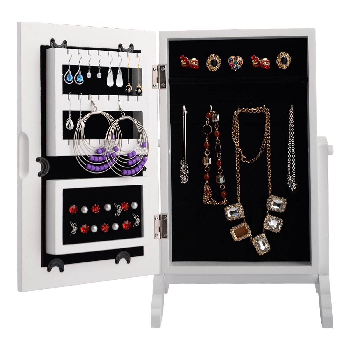 Šioje praktiškoje papuošalų spintelėje Jūsų brangūs papuošalai bus saugiai ir tvarkingai saugomi. Joje rasite gausybę vietos žiedams, auskarams, apyrankėms ir karoliams – kiekvienas papuošalas turės savo vietą juodu aksomu išklotame viduje. Integruotas veidrodis leis patogiai pasimatuoti ir apžiūrėti pasirinktus aksesuarus, o tvirta MDF konstrukcija užtikrins spintelės ilgaamžiškumą.