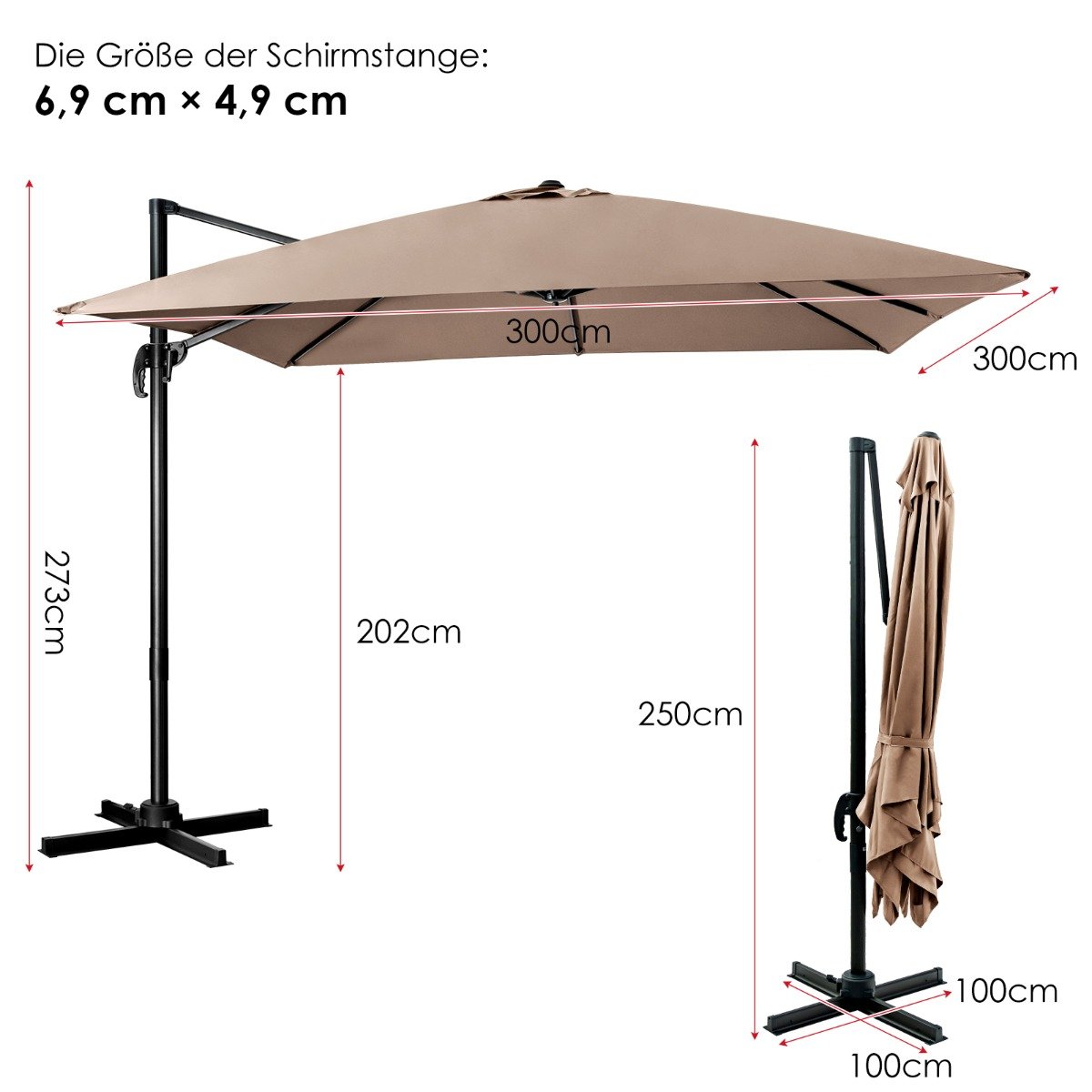 - Didelis skersmuo (300×300 cm) užtikrina platų pavėsio plotą.