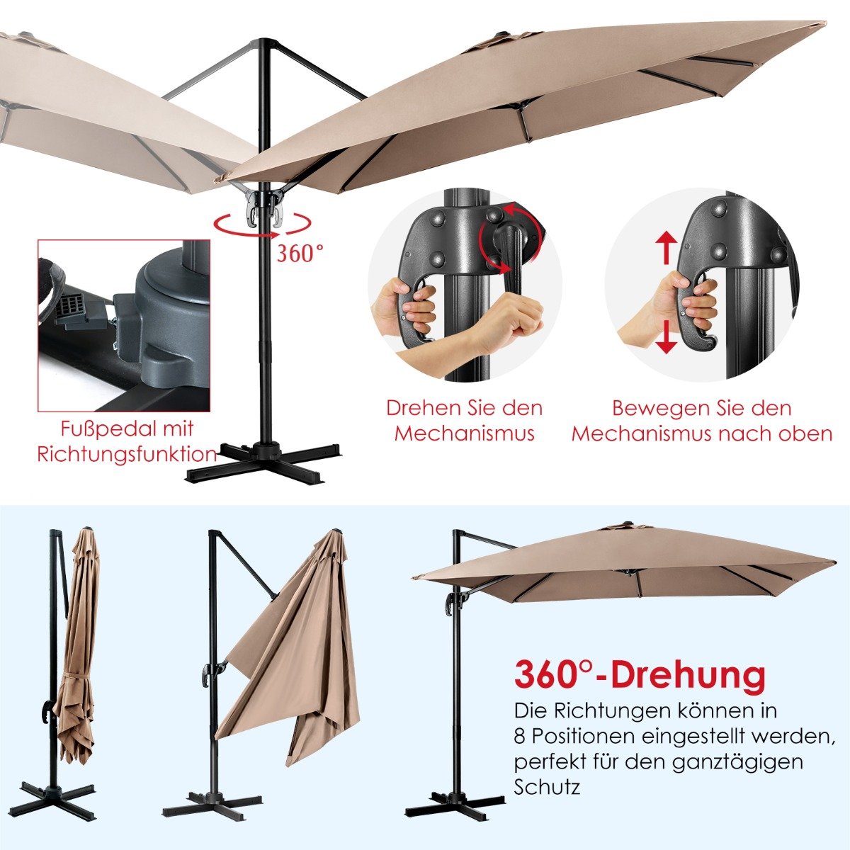 - Skėtis sukamas 360° kampu ir turi 8 skirtingus pasvirimo kampo nustatymus.