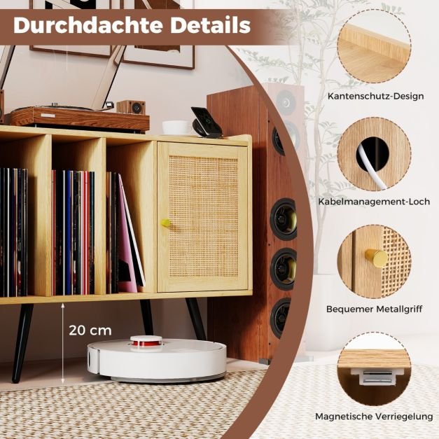 - Universalus panaudojimas – tinka ne tik vinilinių plokštelių grotuvams, bet ir kaip bufeto, darbo, svetainės ar naktinis staliukas.
