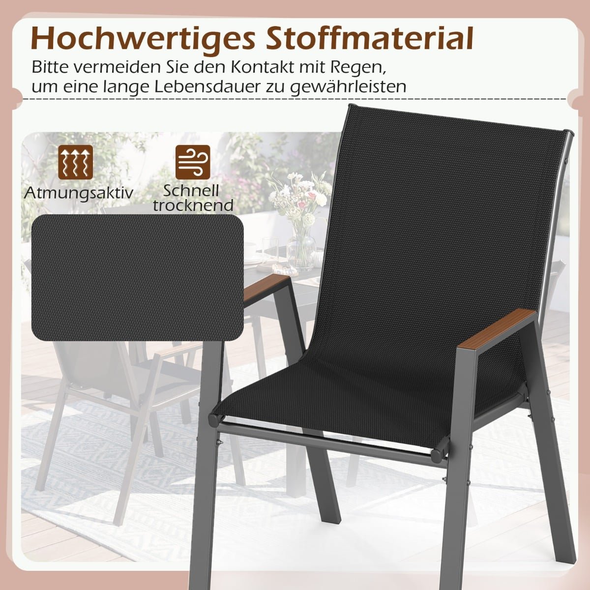 Mėgaukitės maksimaliu komfortu ir stiliumi su šiomis sodo kėdėmis, pagamintomis iš aukštos kokybės, kvėpuojančio Teslin audinio. Greitai džiūstantis ir atsparus oro sąlygoms audinys užtikrina ilgaamžiškumą, o ergonomiškas atlošas, plati sėdynė ir lygūs medžio-plastiko porankiai garantuoja puikią atramą. Tvirtas metalinis rėmas su papildomu sutvirtinimo strypu ir neslystančiais kojų antgaliais užtikrina kėdžių stabilumą ir saugumą. Lengvos ir kraunamos, jos taupo erdvę, kai nenaudojamos, ir puikiai tinka sodui, balkonui ar terasai.