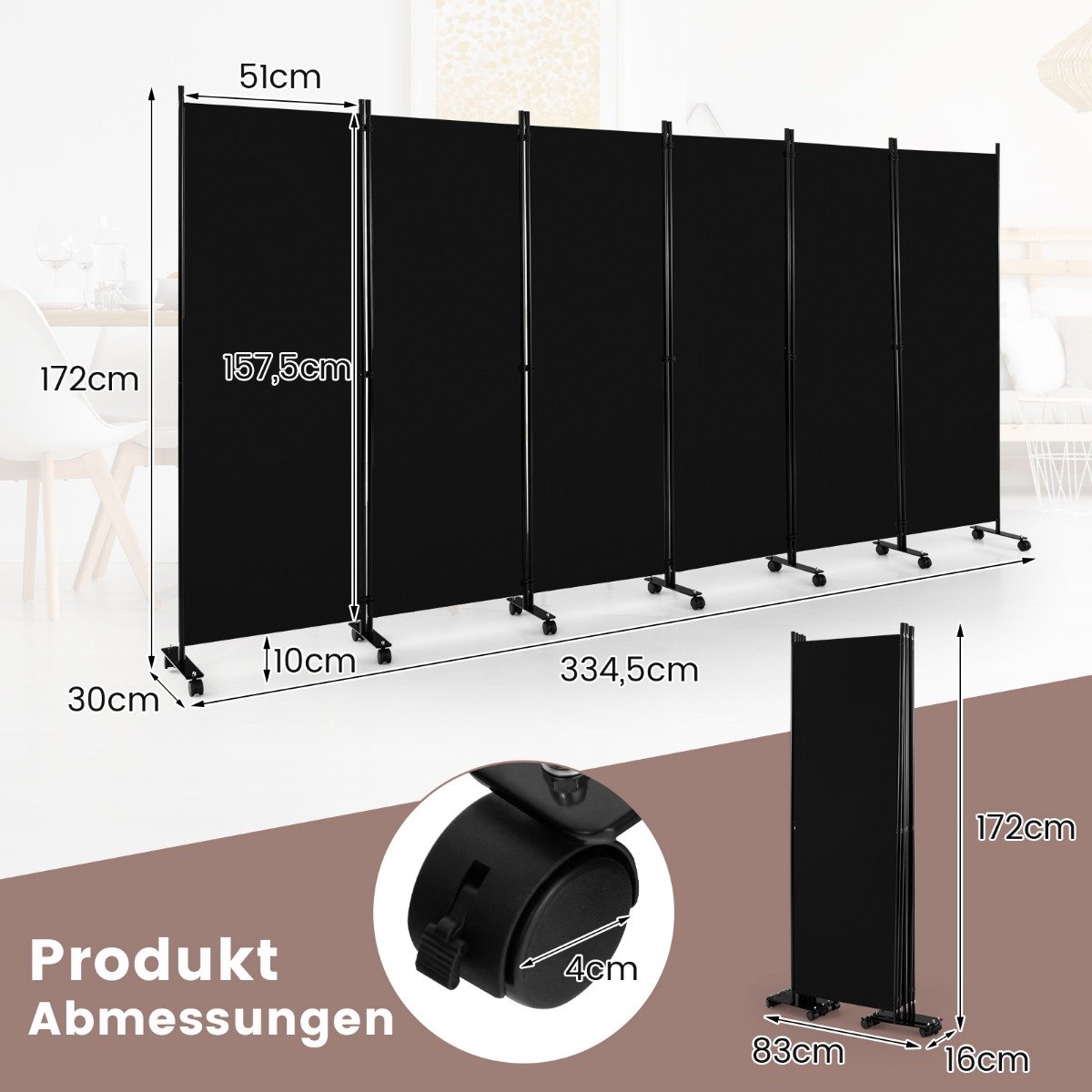 Sulankstoma 6 dalių kambario pertvara su ratukais 172 cm (Juoda)