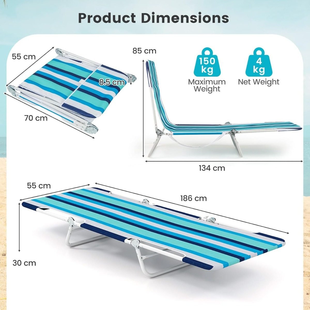 - Matmenys (sulankstytoje padėtyje): 70 x 55 x 8,5 cm (I x P x A)