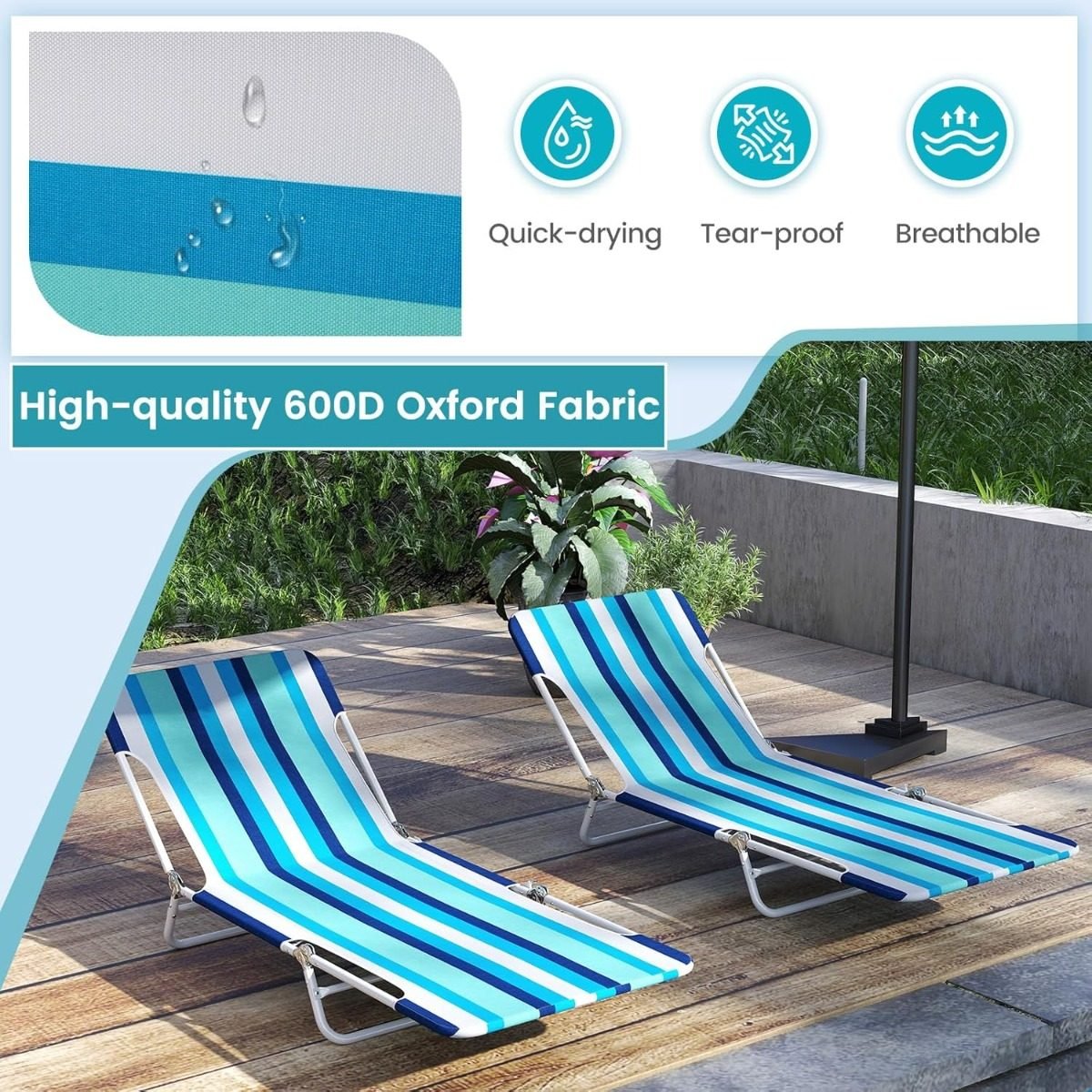 Ši sulankstoma lauko gultavietė – puikus pasirinkimas atpalaiduojančiam poilsiui lauke. Jos 5 padėtis reguliuojamas atlošas leidžia pritaikyti gultavietę pagal Jūsų poreikius – nuo sėdimos iki visiškai atlenktos padėties, todėl galėsite patogiai skaityti ar mėgautis saulės voniomis.