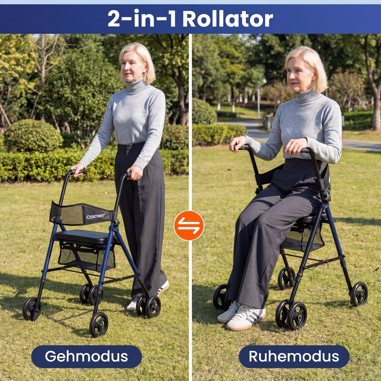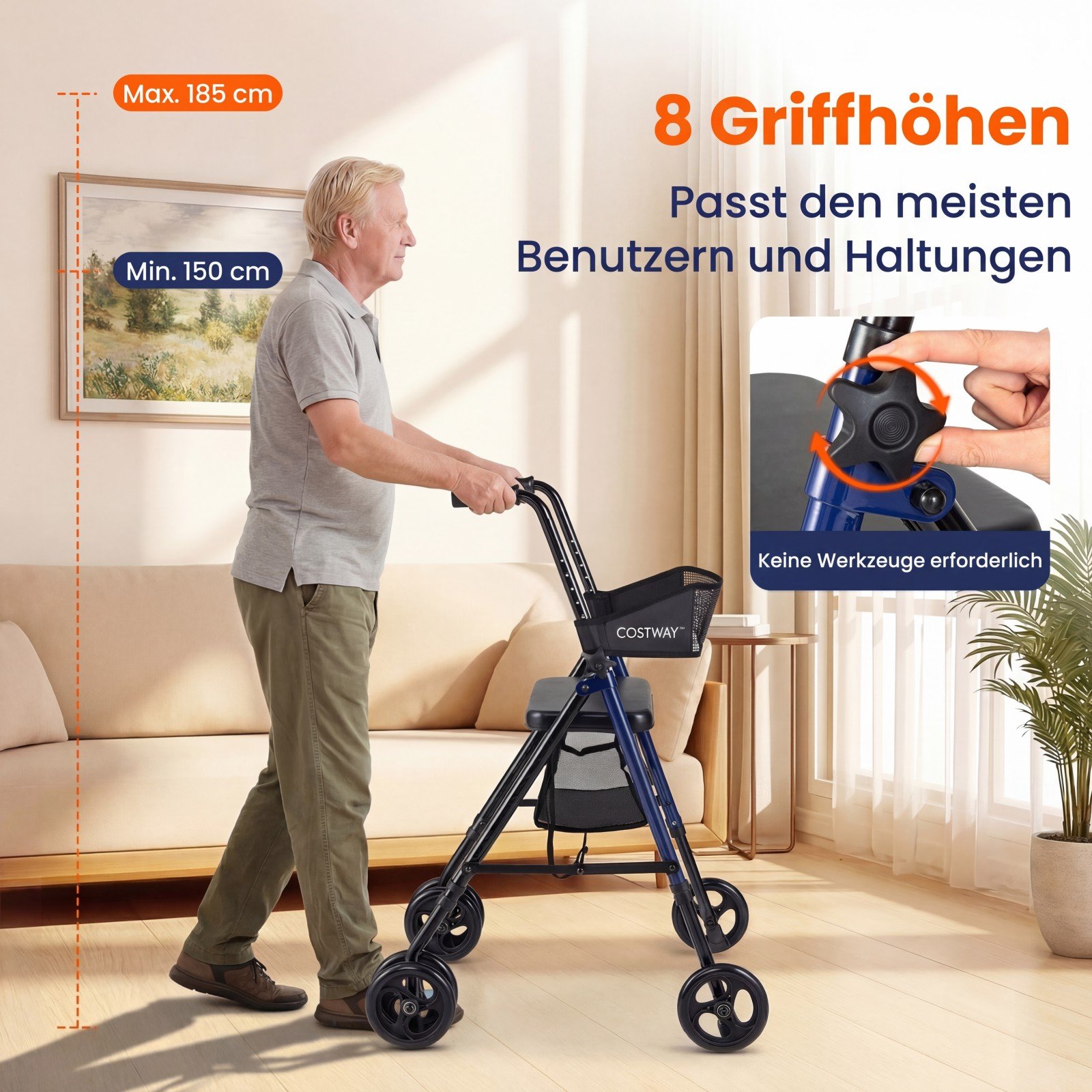 Ši tvirta ir patogi vaikštynė su sėdyne puikiai tinka kasdieniam naudojimui ir kelionėms. Jos tvirtas metalinis rėmas su sustiprintomis trikampėmis atramomis užtikrina stabilumą ir atlaiko iki 136 kg. Paminkštinta sėdynė ir ergonomiškos rankenos užtikrina maksimalų komfortą, o lengvai sulankstoma konstrukcija leidžia patogiai transportuoti ir sandėliuoti.