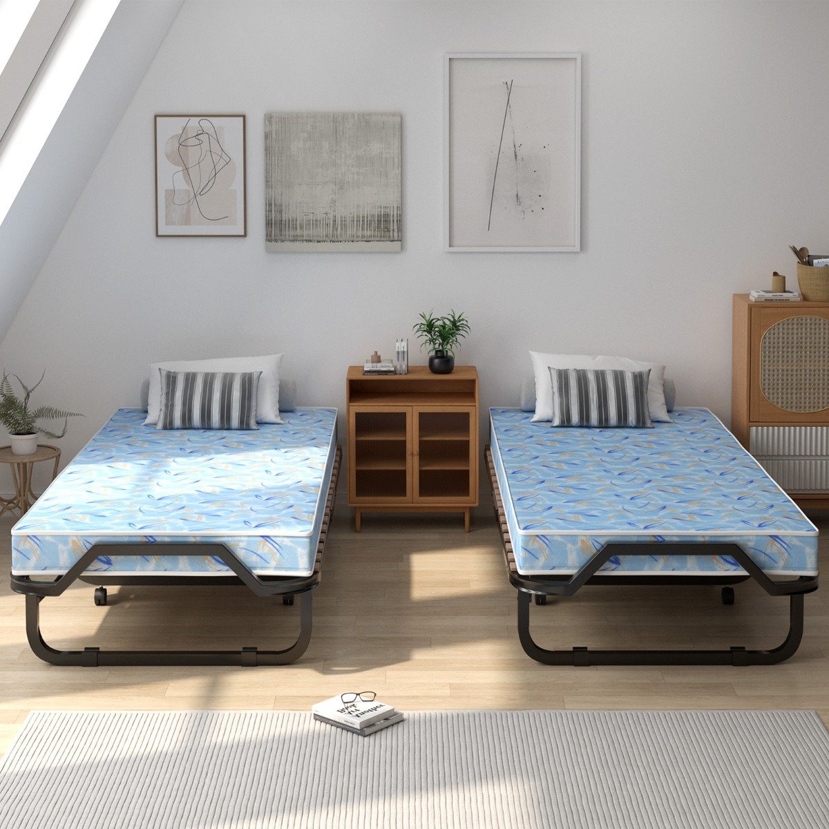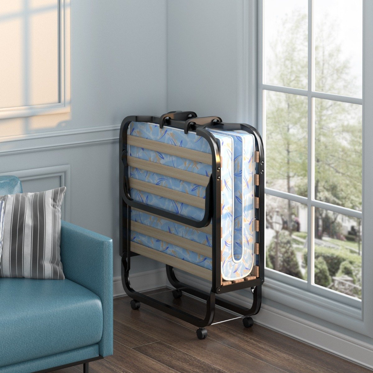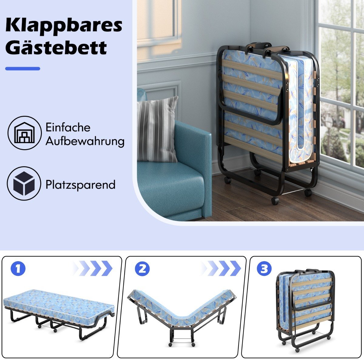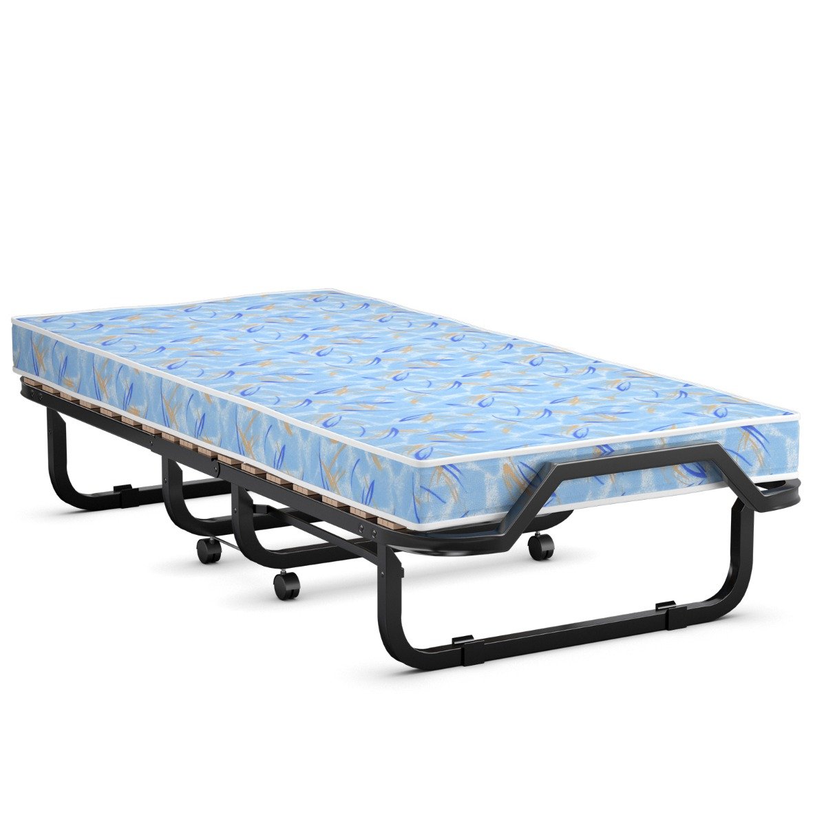 Sulankstoma lova su 10 cm putų poliuretano čiužiniu ir ratukais (Mėlyna)