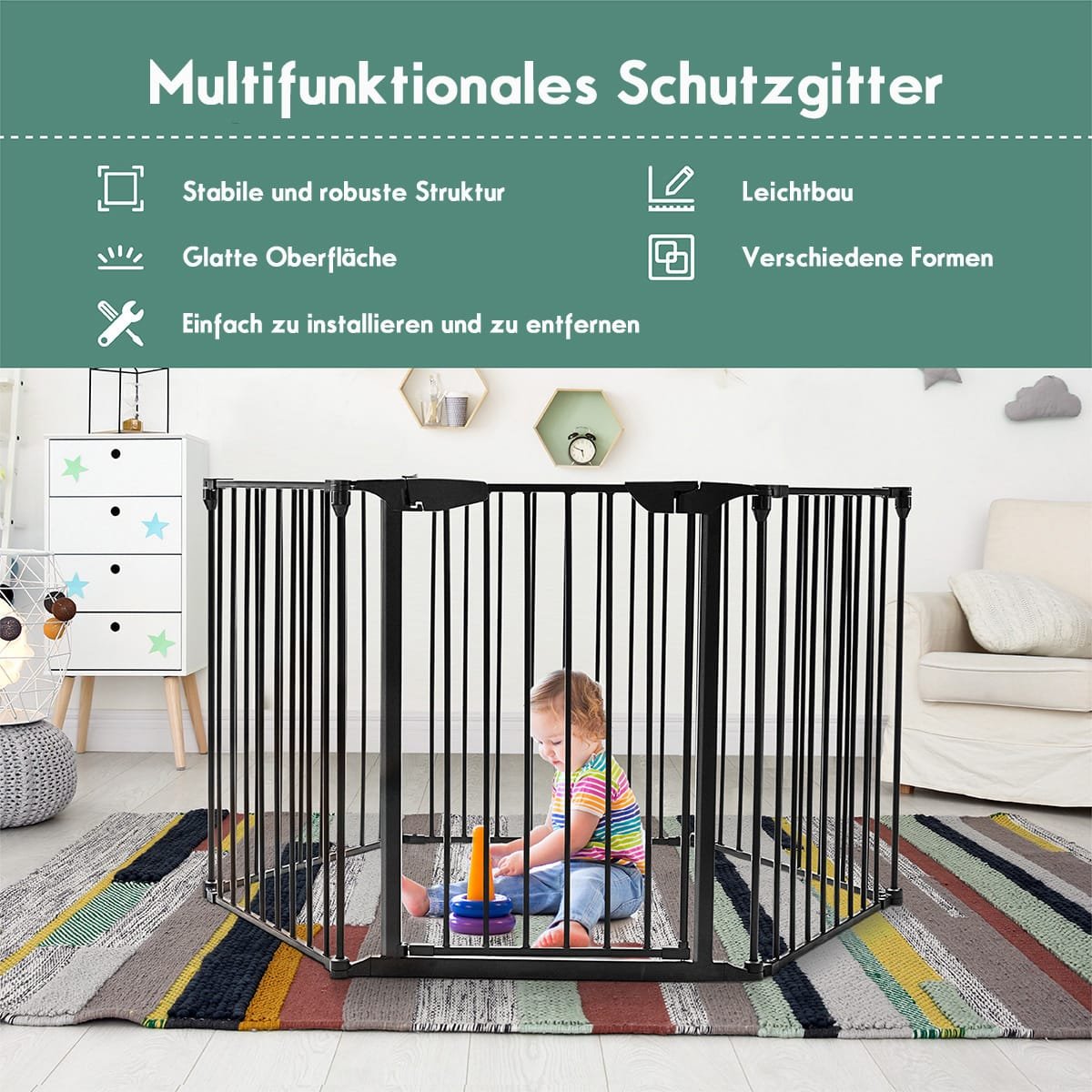 - Daugiafunkcis pritaikymas: gali būti naudojama kaip maniežas, laiptų ar durų užtvara, židinio apsauga.