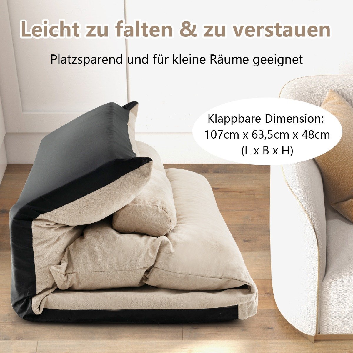 • Matmenys sulankstytos sofos režimu: 107 x 70 x 66 cm (I x P x A)