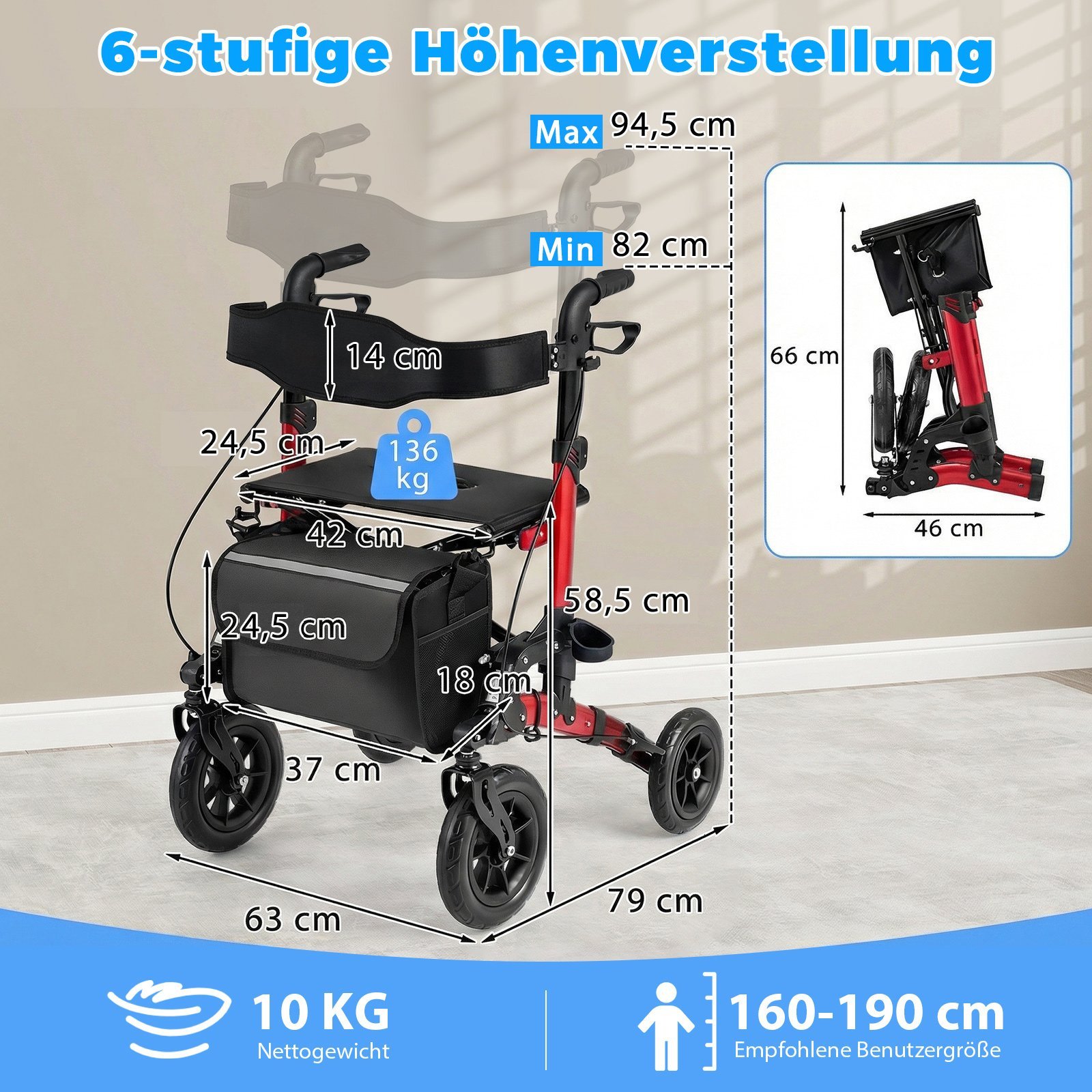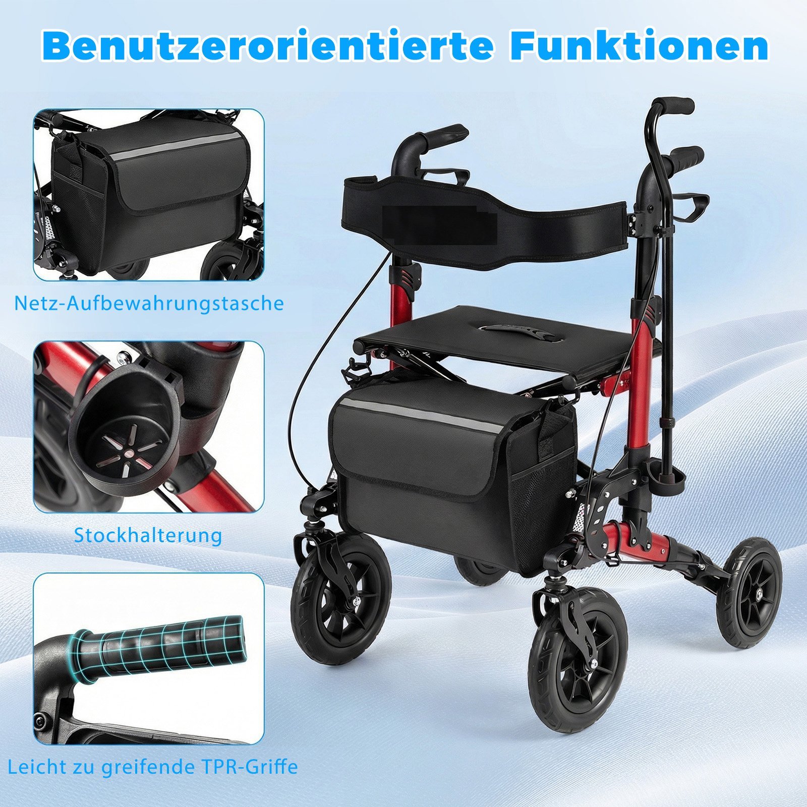 Sulankstoma vaikštynė-vežimėlis senjorams su sėdyne (Raudona)