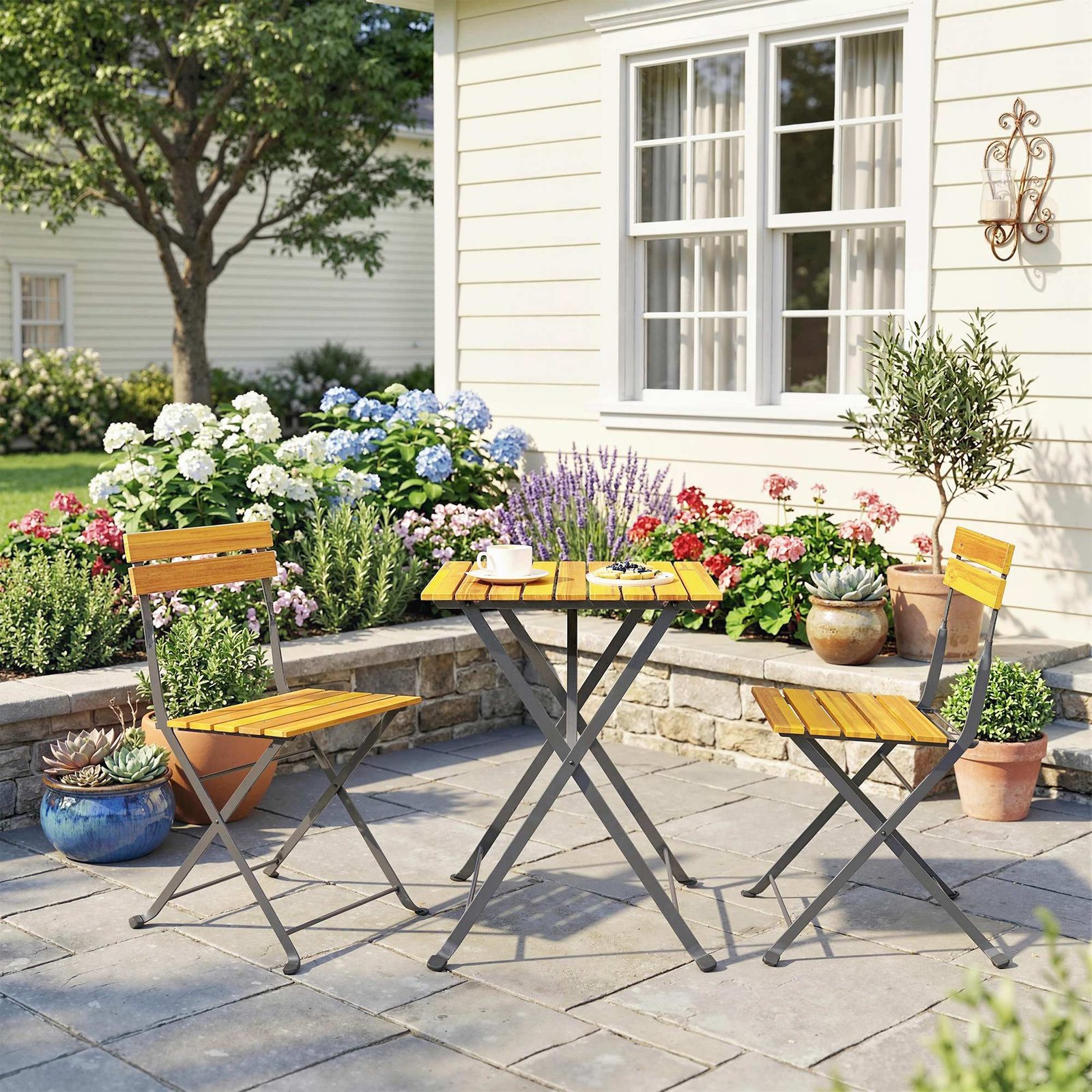 Suteikite savo sodui ar žiemos sodui naujos gyvybės su šiuo sodo baldų komplektu. Elegantišką komplektą sudaro dvi sulankstomos kėdės ir stalas iš masyvios akacijos medienos su nerūdijančio plieno rėmu. Idealus lengvam laikymui ir transportavimui, šis bistro komplektas praturtins bet kokią aplinką. Puikiai tinka spontaniškiems susitikimams lauke!