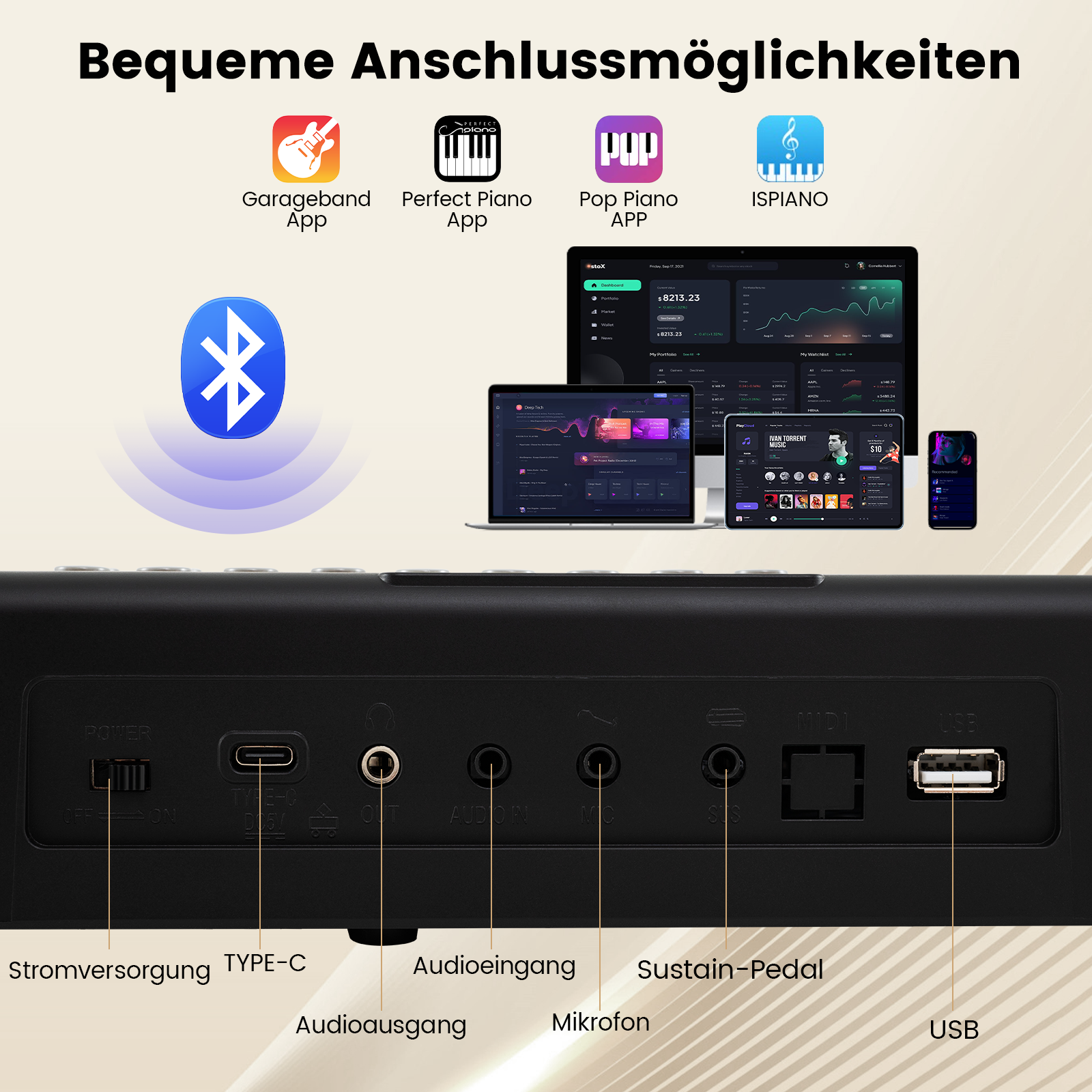 Atskleiskite savo muzikinį talentą su šiuo 61 klavišo skaitmeniniu pianinu! Sukurtas specialiai pradedantiesiems, jis pasižymi aiškiu ir rezonuojančiu garsu per integruotus garsiakalbius, užtikrinant gilų ir įtraukiantį grojimo potyrį.