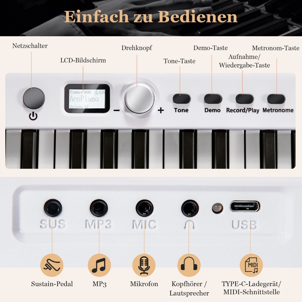 - 88 pusiau svertiniai klavišai su medžio rašto dizainu užtikrina tikro pianino pojūtį.