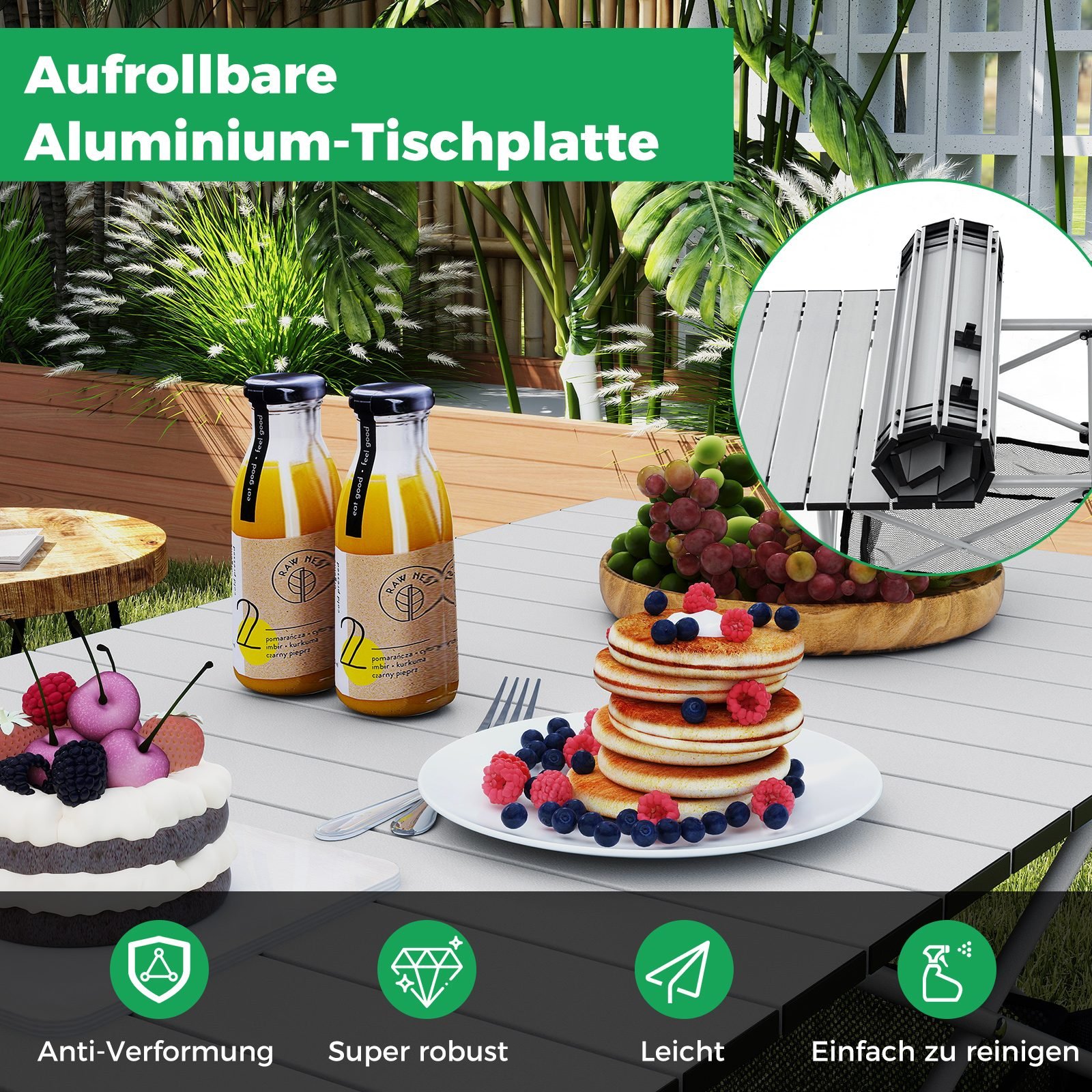 - Tvirtas ir lengvas aliuminio stalviršis, kurį paprasta prižiūrėti.
