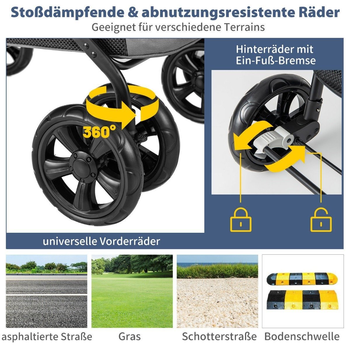 - Sklandų važiavimą garantuoja amortizuojantys universalūs ratai su stovėjimo stabdžiu.