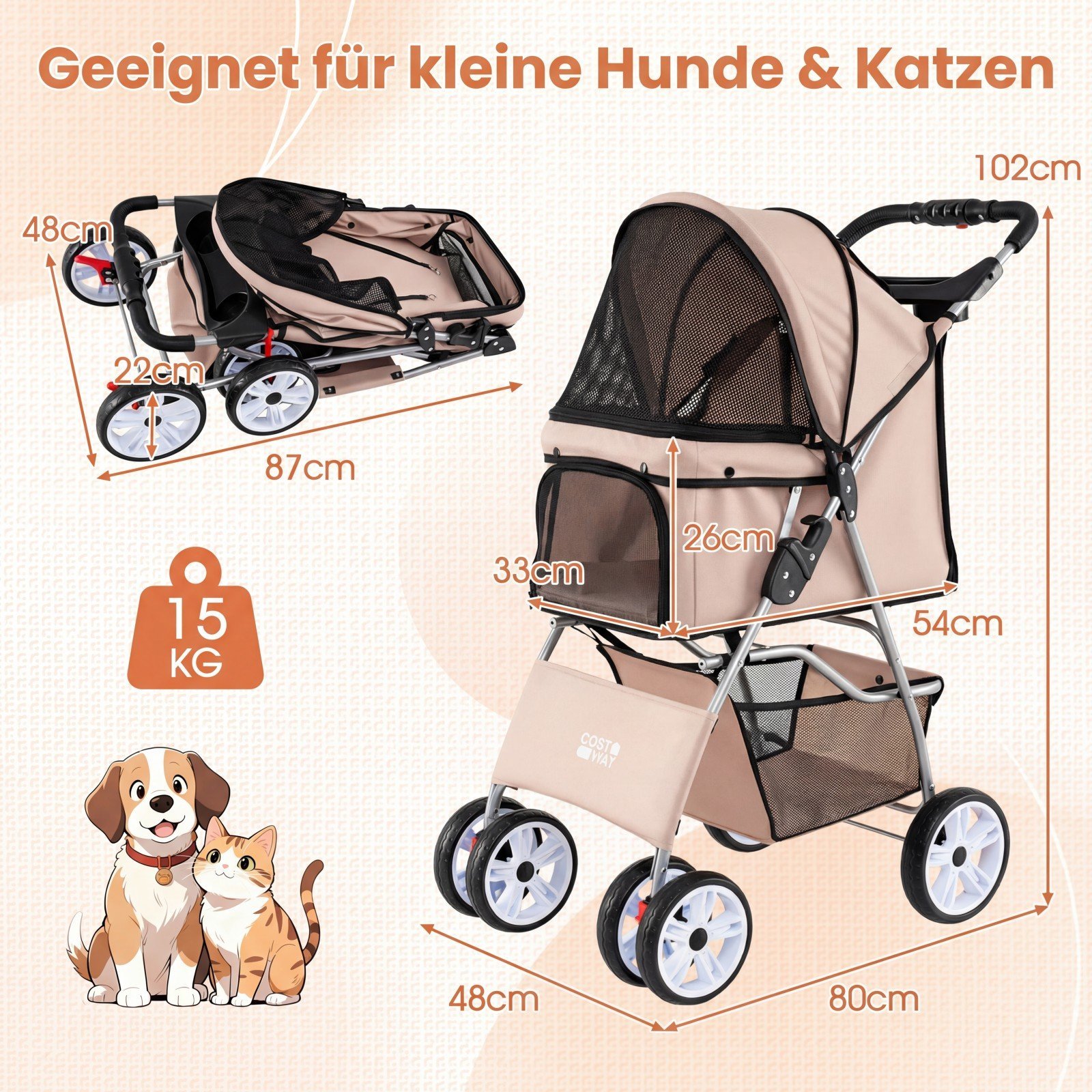 Sulankstomas augintinių vežimėlis su visureigiais ratais (Smėlio spalva)