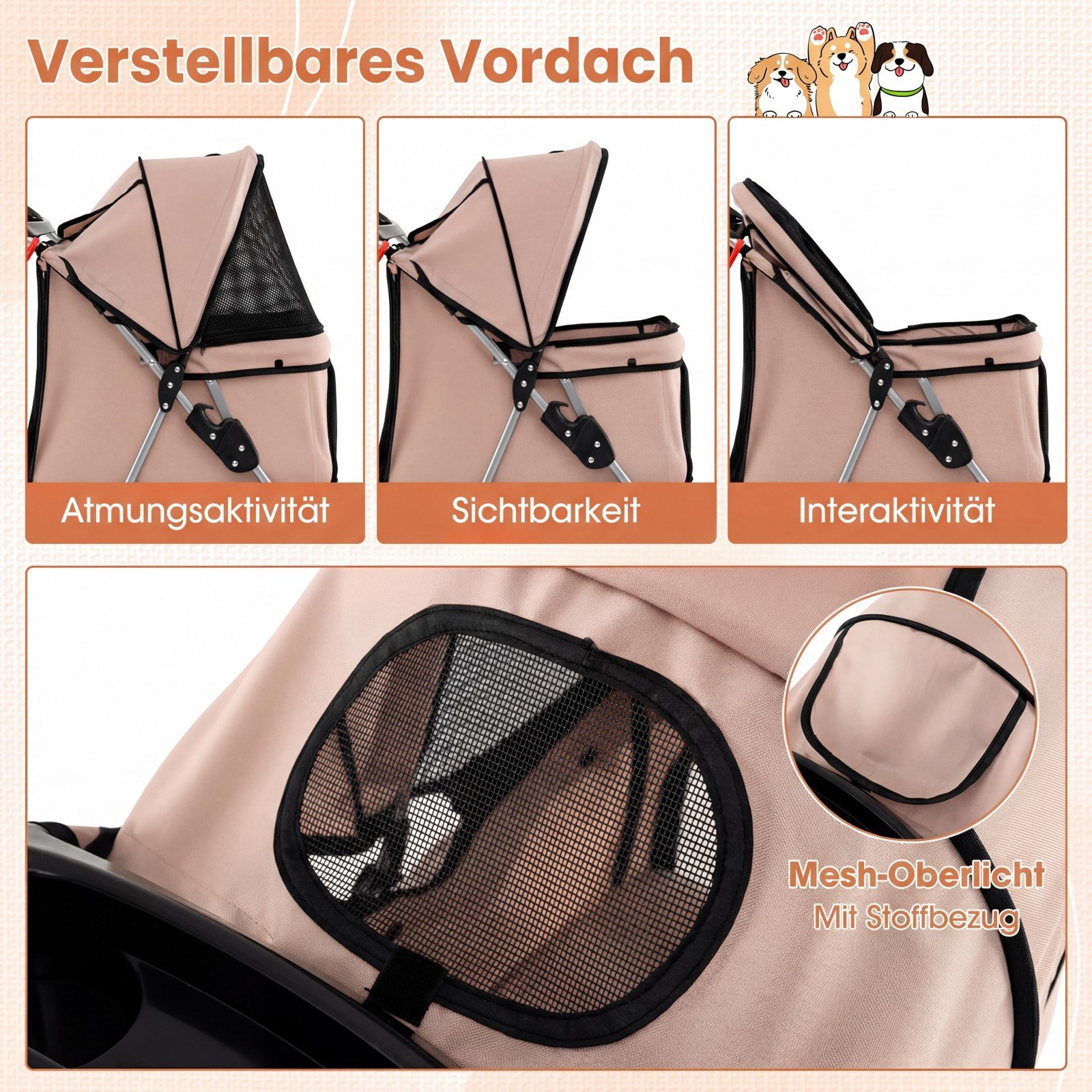 - Reguliuojamas stogelis ir panoraminiai tinkliniai langai su užtrauktukais suteikia puikų vėdinimą, vaizdą ir lengvą prieigą.