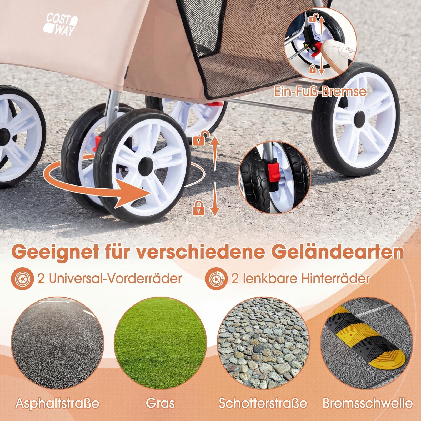 - Sukiojami priekiniai ratai su fiksatoriumi ir galiniai ratai su vieno paspaudimo stabdžiu užtikrina stabilų ir saugų važiavimą įvairiais paviršiais.
